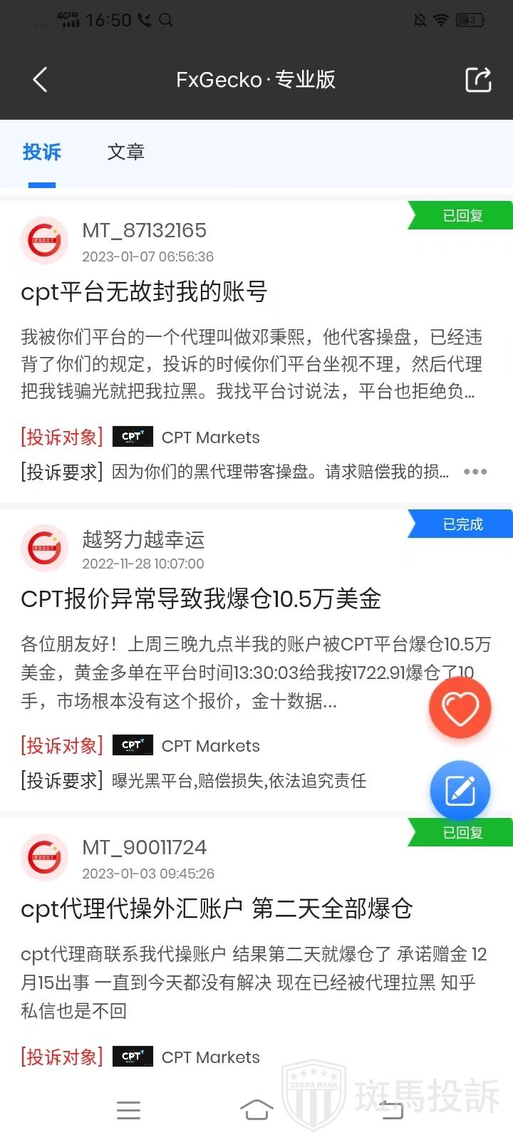 目前CPT Markets在FxGecko上的投诉高达81条,客诉都是集中于不给出金、不给盈利、吃客损等情况,还有对于投资者各种交易问题的密集投诉,CPT非但没有及时处理解决,反而粗暴拉黑,甚至不少投资者都表示自己莫名被封号的问题,请大家注意风险。