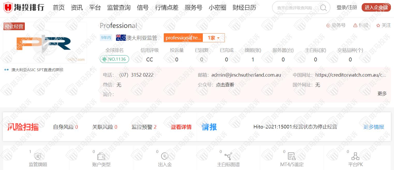 这家平台叫Professional,全球排名1136名,目前停止经营,该平台从2013年开始受澳大利亚ASIC监管,监管号码434290,目前监管已失效,风险扫描显示2条风险,投资者资金安全无保障。