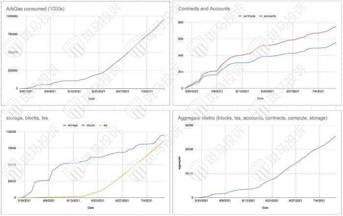 为了让大家更清楚地了解当前情况,以下几个图表反映了我们首次面向开发者开放Arbitrum One以来的活跃度情况。我们可以看到,随着在ArbitrumOne上部署和测试产品的团队增多,Arbitrum One的活跃度有了大幅跃升。