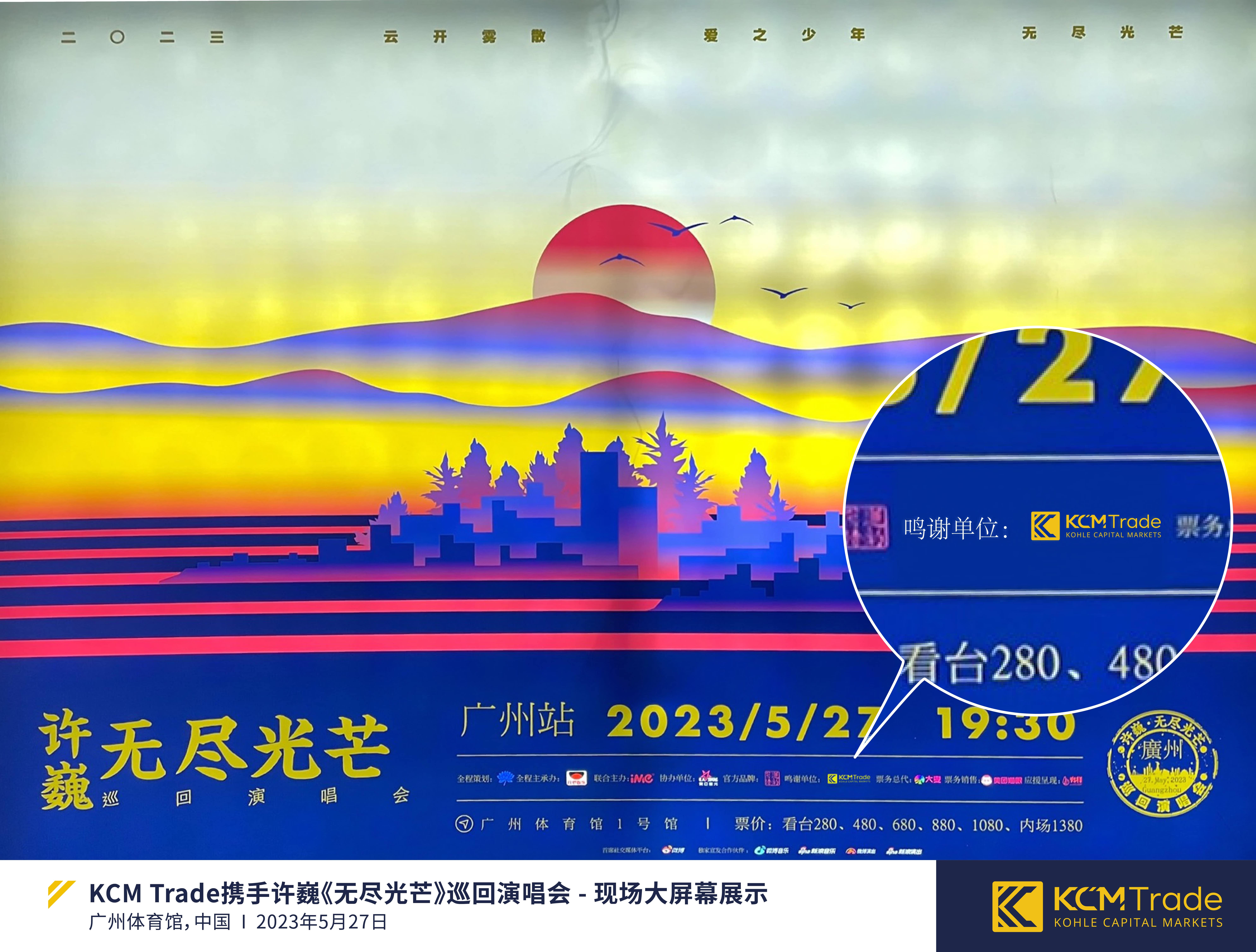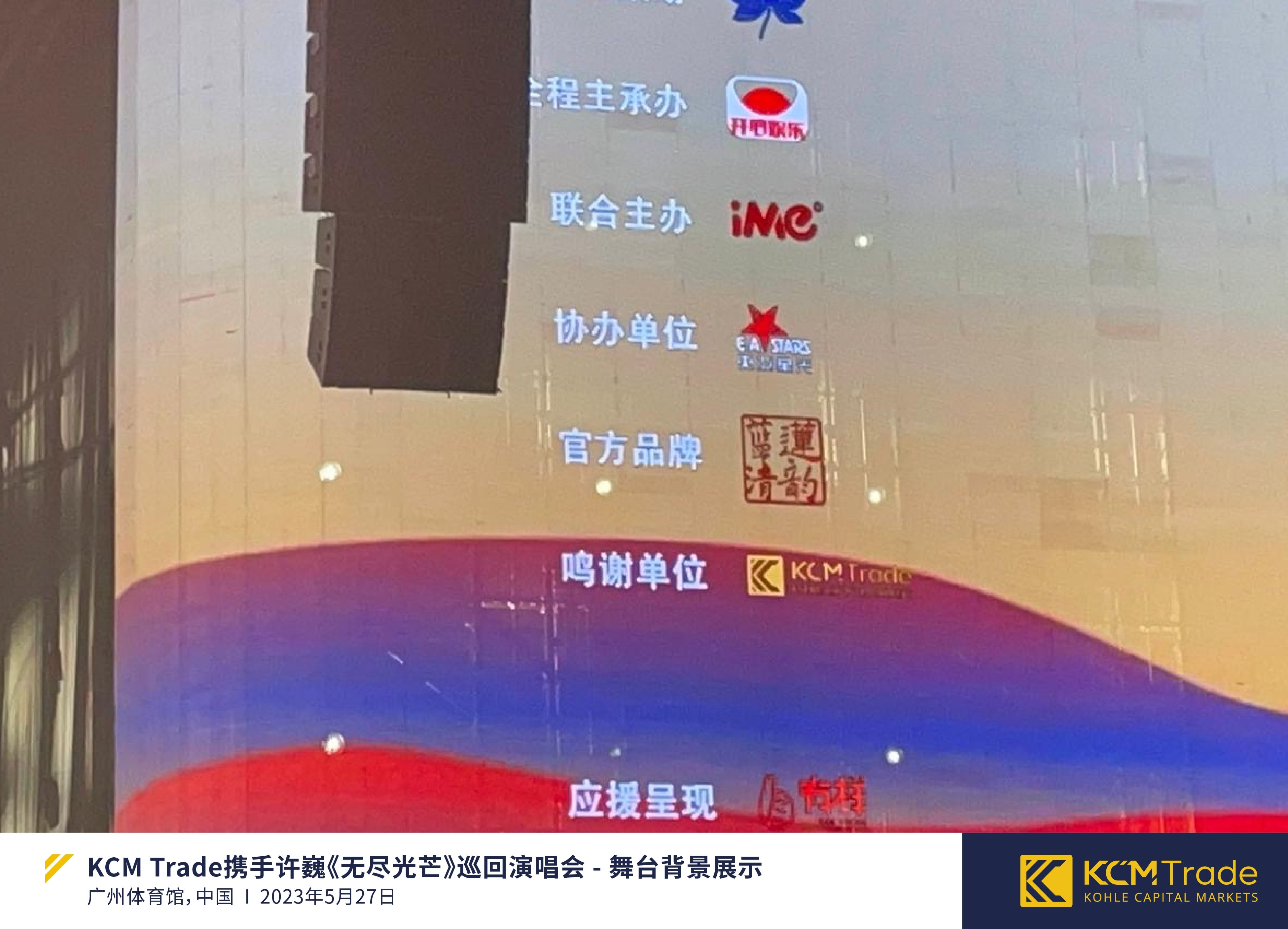 当最后一曲落下帷幕,舞台背景展示出《无尽光芒》专辑的封面和感谢词时,大屏幕上骄傲地显示着鸣谢单位:KCM Trade