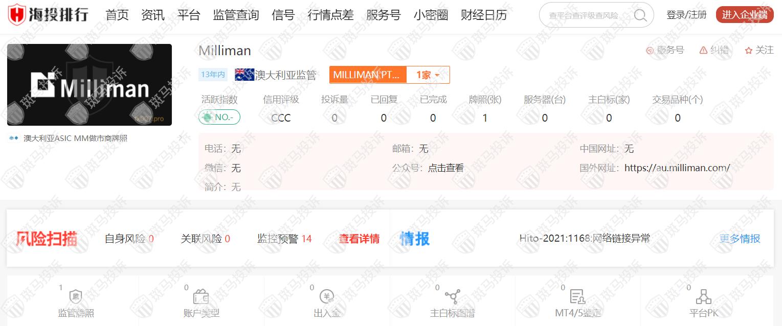 Milliman从2009年开始受澳大利亚ASIC监管,监管号码340679,风险扫描显示14条风险,投资者需注意其风险提示信息。