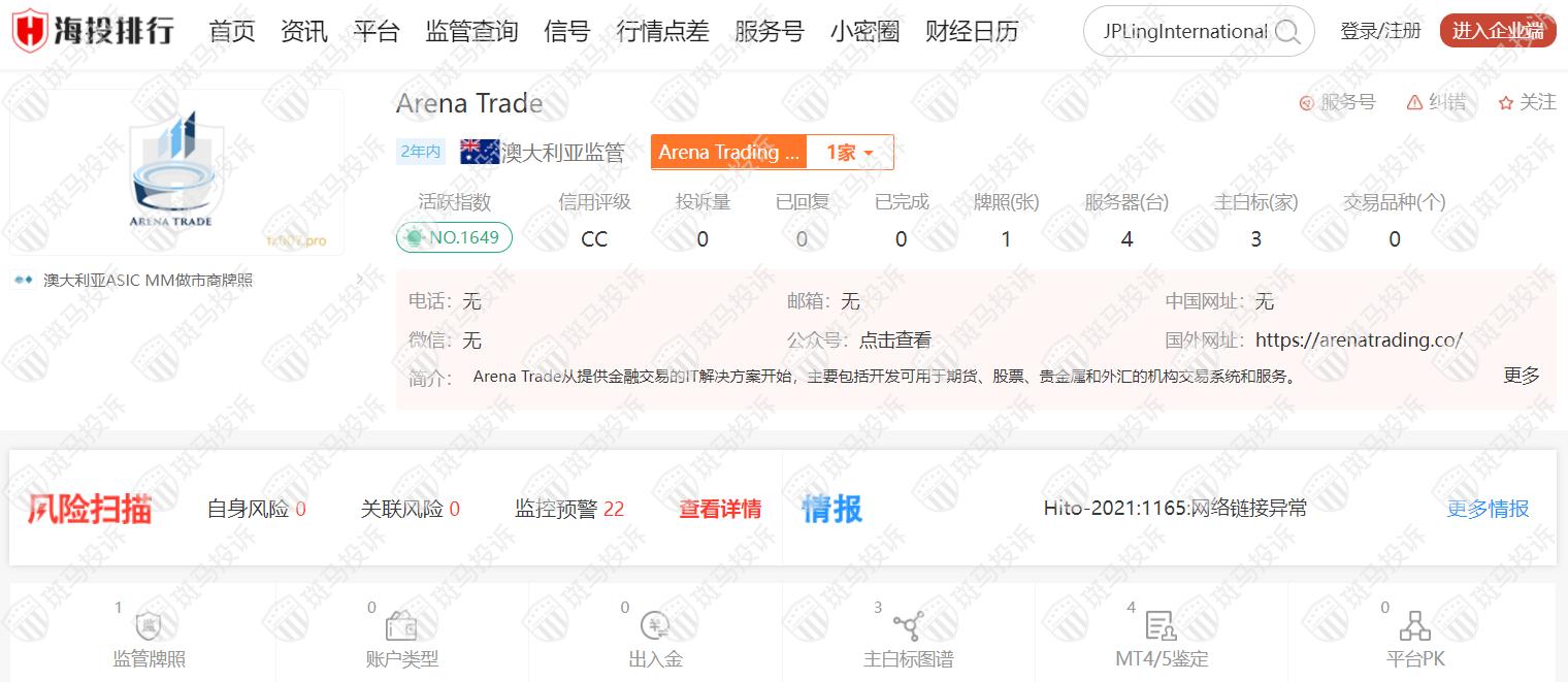 这家平台叫Arena Trade,全球排名1649名,从2013年开始受澳大利亚ASIC监管,监管号码443916,目前监管已停止,风险扫描显示22条风险,投资者资金安全无保障。
