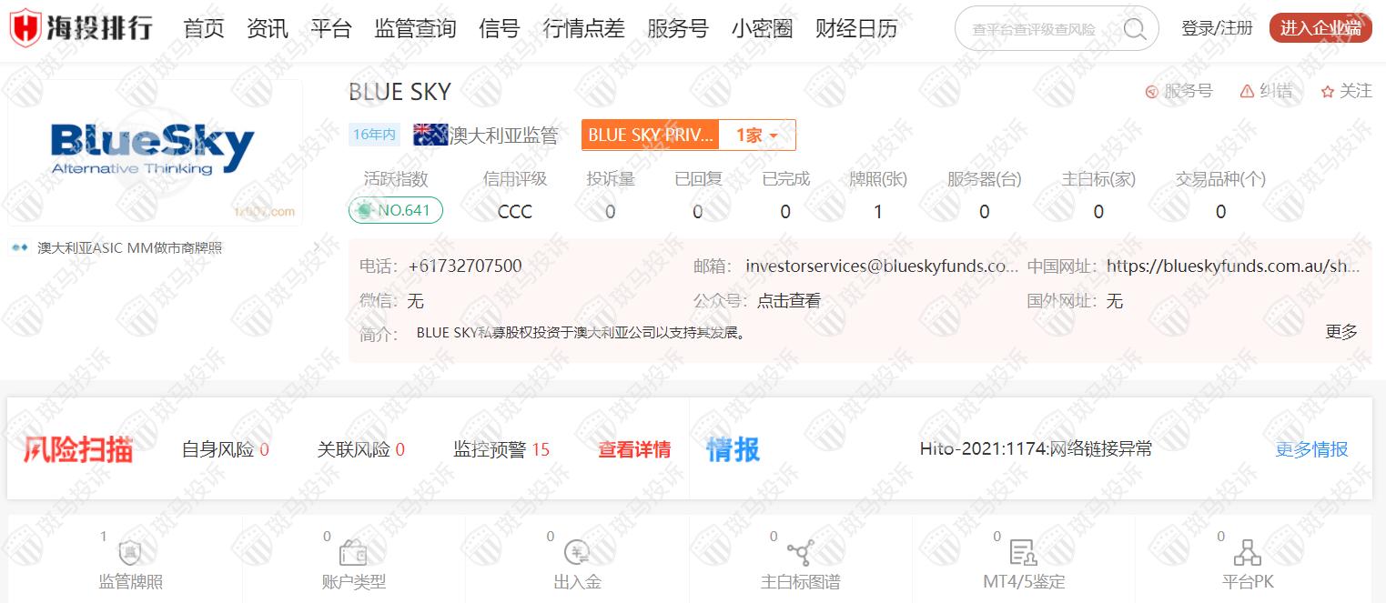 BLUE SKY从2007年开始受澳大利亚ASIC监管,监管号码314177,风险扫描显示15条风险,投资者需注意其风险提示信息。