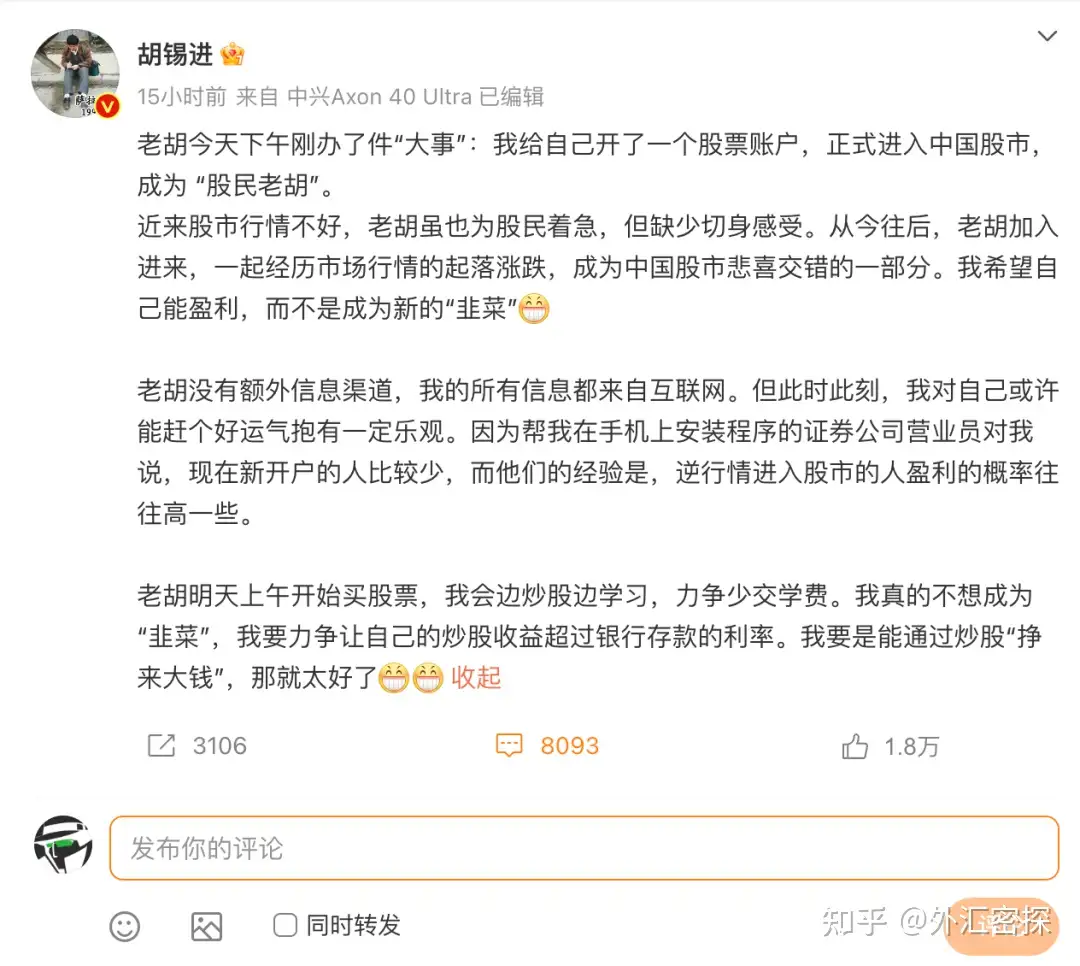 刚看到一条消息:老胡(胡锡进先生)昨天下午刚办了件“大事”,给自己开了一个股票账户,正式进入中国股市,成为 “股民老胡”。