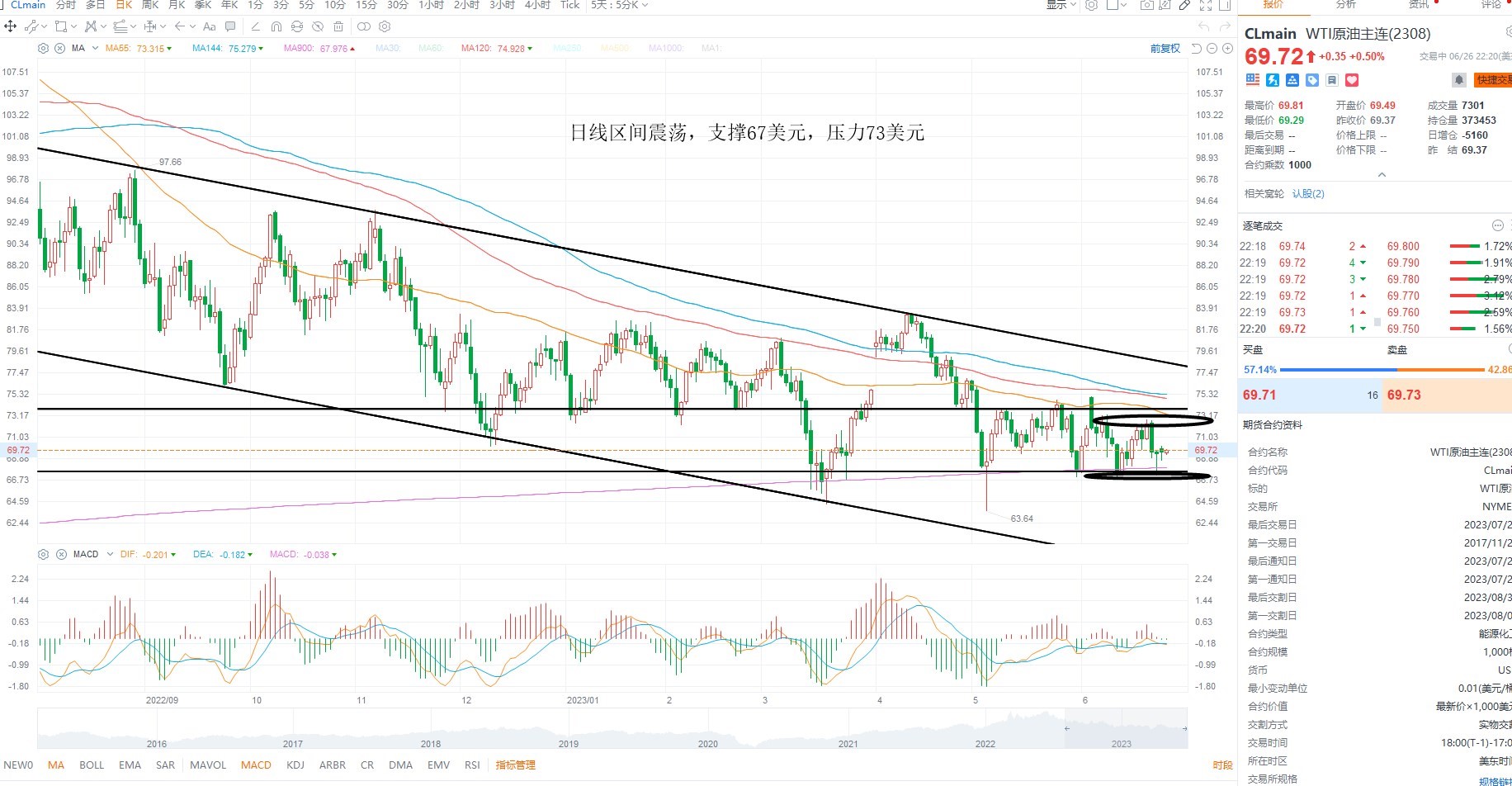 美原油维持区间震荡,目前并未跌破区间支撑,由于地缘局势的紧张情绪施压供给端,但需求下行压力依然很淡,所以整体油价偏空,日内没有破位之前,维持区间对待即可,日线级别多空分水岭67美元不破,等待反弹,上方压力73美元附近,等待压力测试