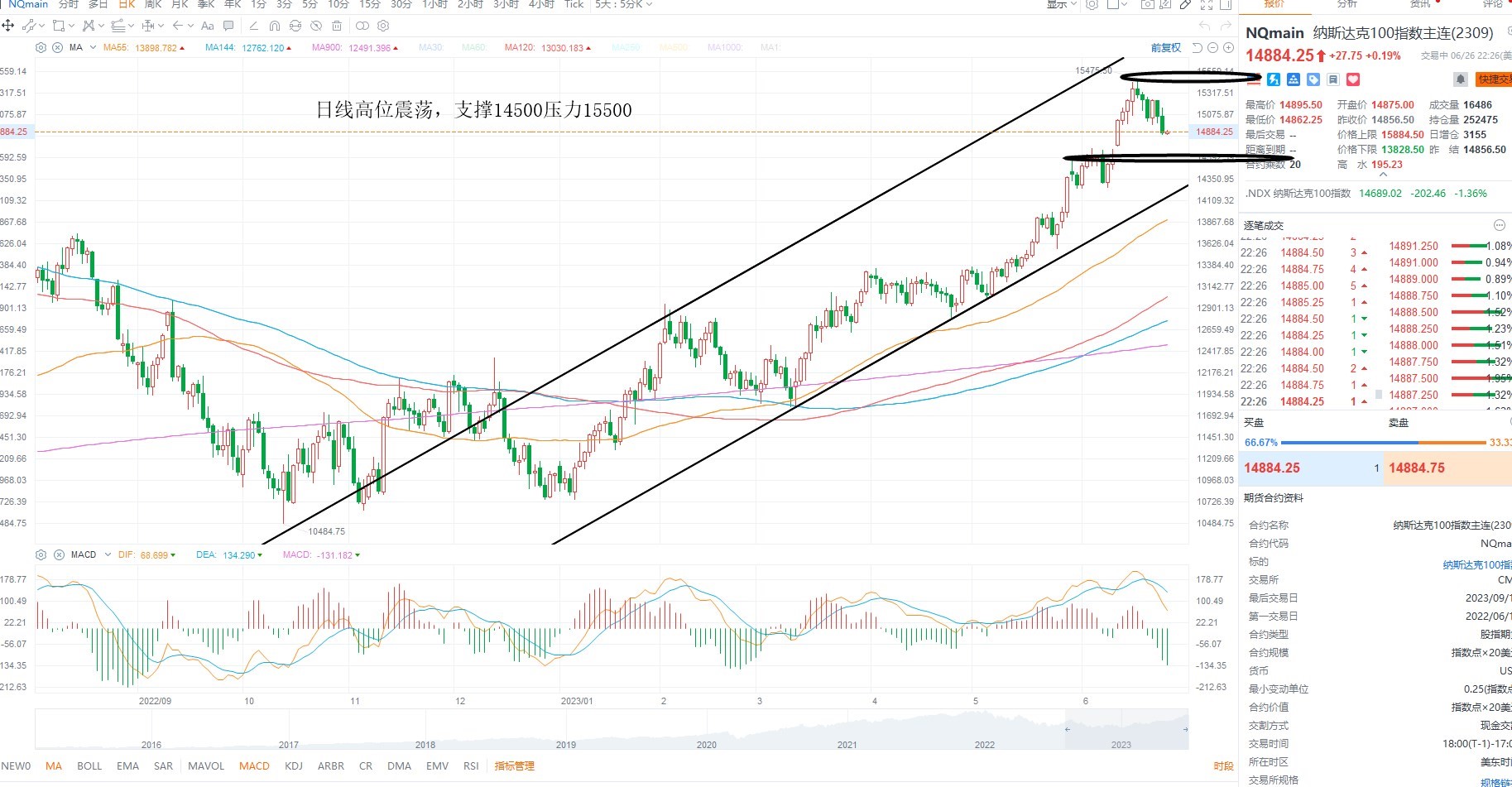 纳斯达克指数震荡调整,短期来看,依然是多头震荡,只是分歧之后市场需要消化获利筹码,等待指标超买修正之后的低吸机会为主,日线级别来看,目前多空分水岭14500附近,盘整不破,则等待二次上行,日内压力前期高点15500附近
