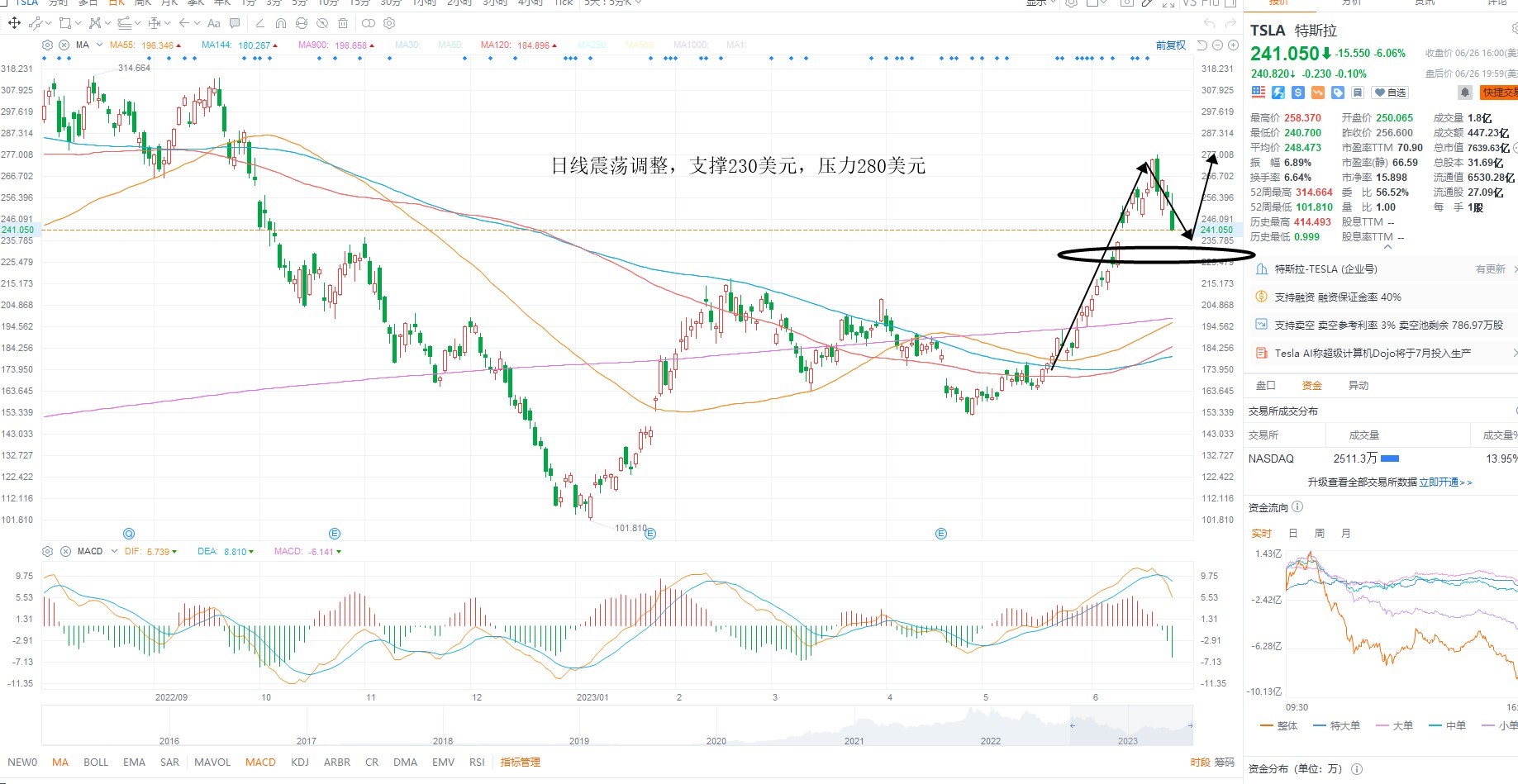TSLA短期冲高回落,目前主要是指标超买之后的修正,但均线缓慢上移,整体反弹结构尚未破坏,等待指数企稳之后的共振反弹机会,日线级别上来看,短期多空分水岭230美元附近不破,则等待企稳低吸,上方压力前期高点280美元附近
