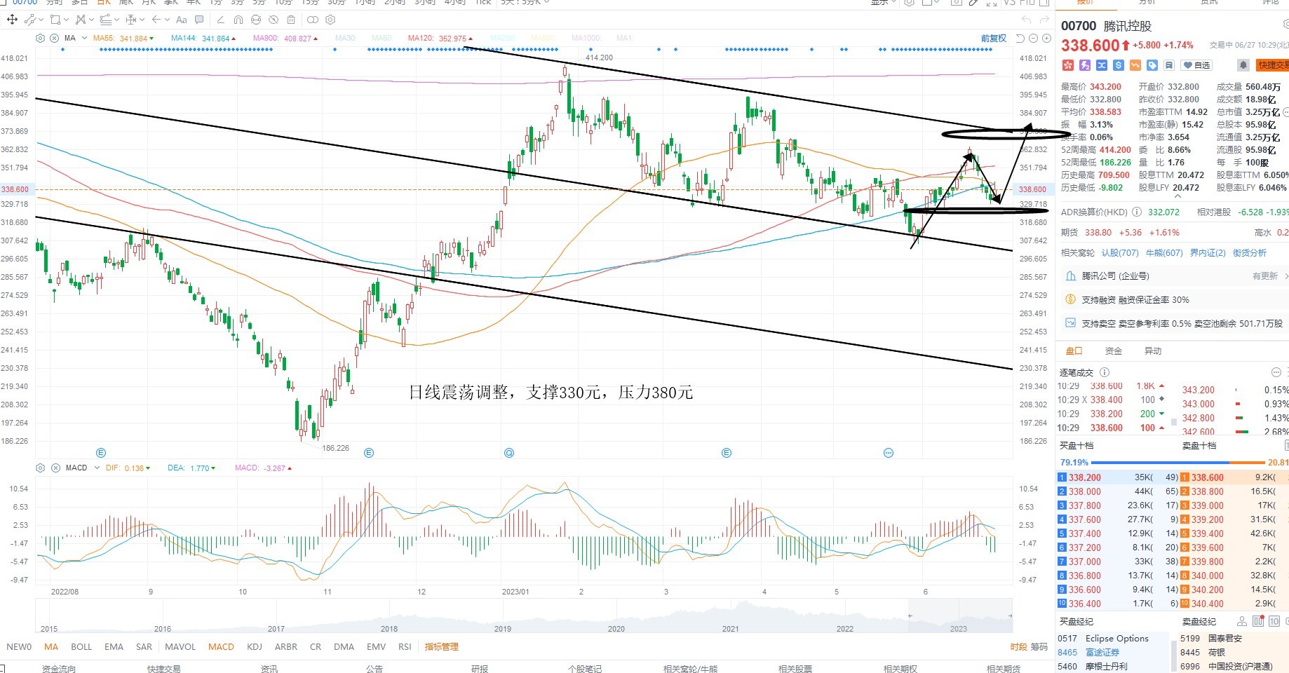 腾讯控股二次回踩,短期市场并未出现明确的企稳迹象,但指数调整,权重压力依然很大,指数的下行空间相对有限,若腾讯控股日线级别维持在330元上方运行,则结构上存在企稳反弹的可能性,日内等待低吸机会,上方压力380元附近