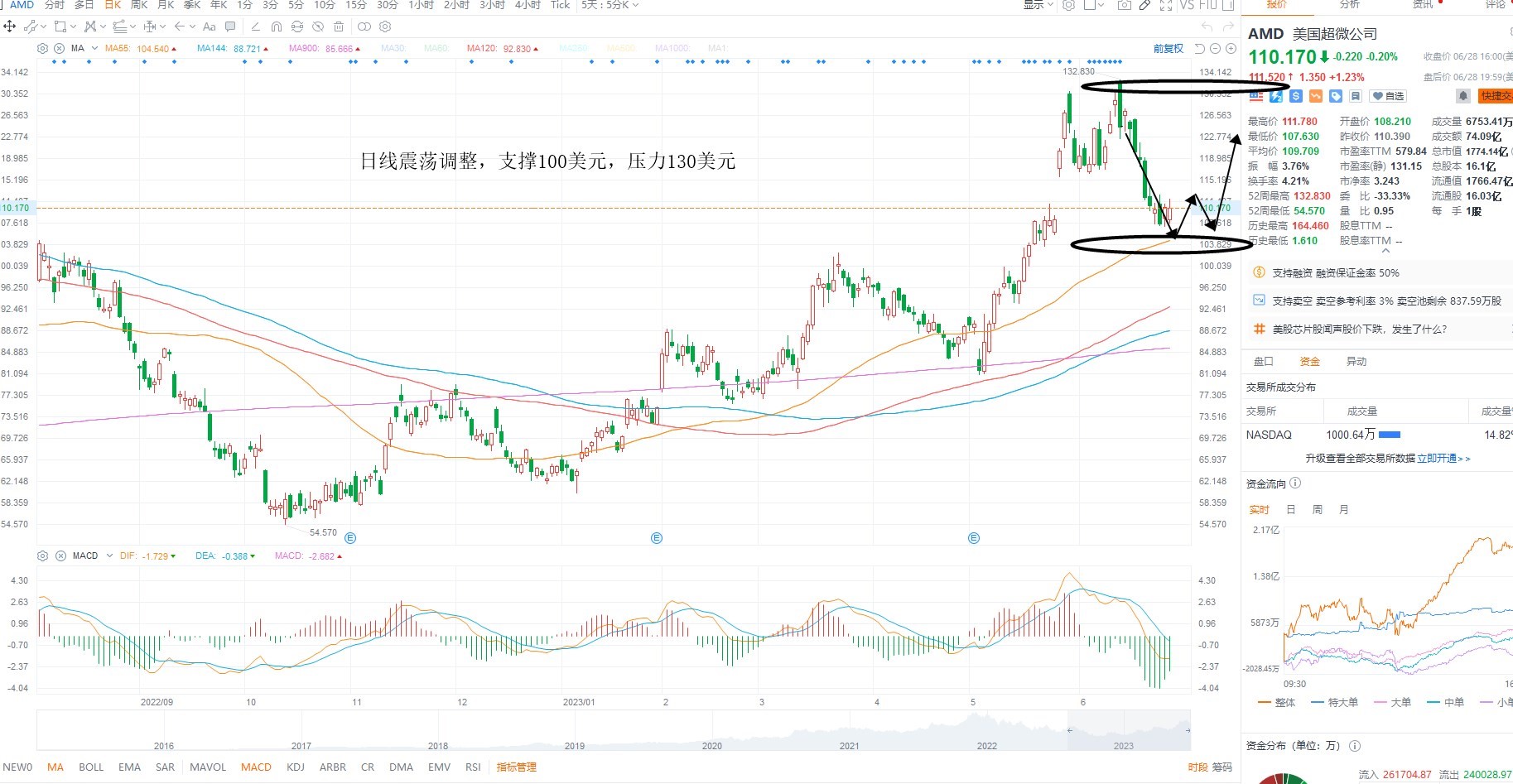 AMD短期继续震荡回踩,结构上并未出现明确的破位迹象,所以等待指数调整之后的共振机会,而目前半导体板块集体调整,但是并未破位,所以大概率指标修正之后有望再次企稳,日线级别上来看,短期多空分水岭100美元附近,等待低吸机会,上方压力前期高点130美元