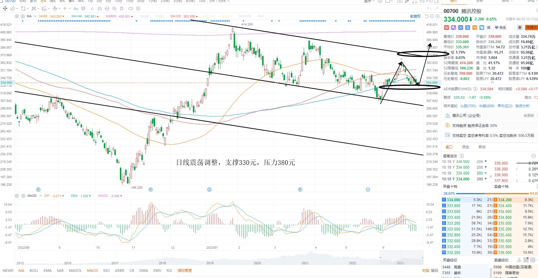 腾讯控股短期继续调整,但并未跌破支撑,而指数下行动力不足,所以权重要等指数级别共振才有可能出现止跌反弹,日内等待方向选择为主,日线级别多空分水岭330元不破,等待低吸,上方压力380元附近