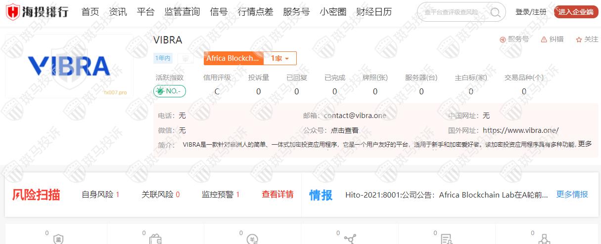 这家平台叫VIBRA,成立于2021年,活跃指数未显示,目前无监管,但是没有外汇牌照,不能做外汇保证金交易,风险扫描显示2条风险,投资者资金安全无保障。