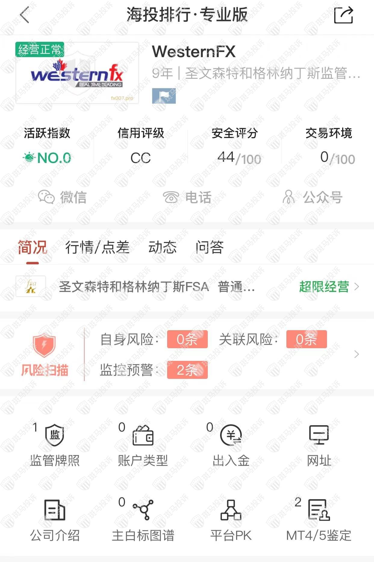 这家平台叫WesternFX,成立于2013年,无全球排名,目前有圣文森特和格林纳丁斯FSA监管,但是没有外汇牌照,不能做外汇保证金交易,风险扫描显示2条风险,投资者资金安全无保障。