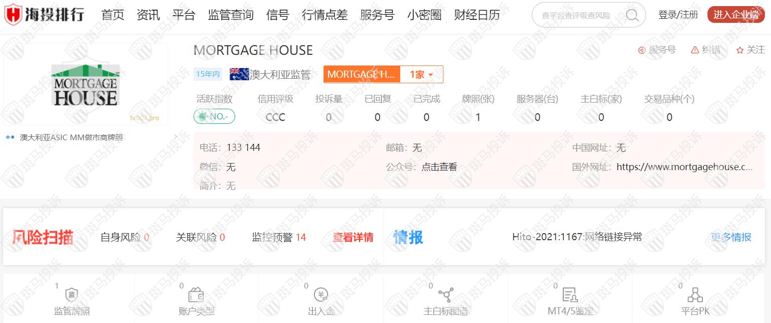 MORTGAGE HOUSE平台从2007年开始受澳大利亚ASIC监管,监管号码312912,风险扫描显示14条风险,投资者需注意其风险提示信息。
