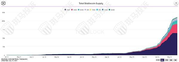 7月17日,The Block数据显示,稳定币的总供应量已超过1100亿美元大关。其中,USDT以58.73%的市场份额占比排名首位,USDC占比23.34%,BUSD占比10.29%,DAI占比5.01%。