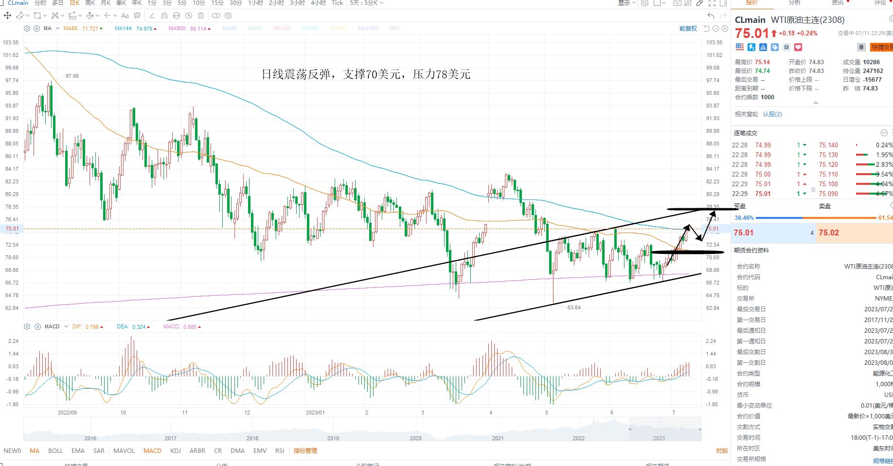 美原油震荡反弹,短期结构偏多,主要是供给端的担忧情绪支撑油价,但需求压力依然存在,短期美元下行,支撑油价,但谨防美联储维持鹰派,七月继续加息,施压油价,日内等待反弹之后的沽空机会为主,日线级别压力78美元,下方支撑70美元