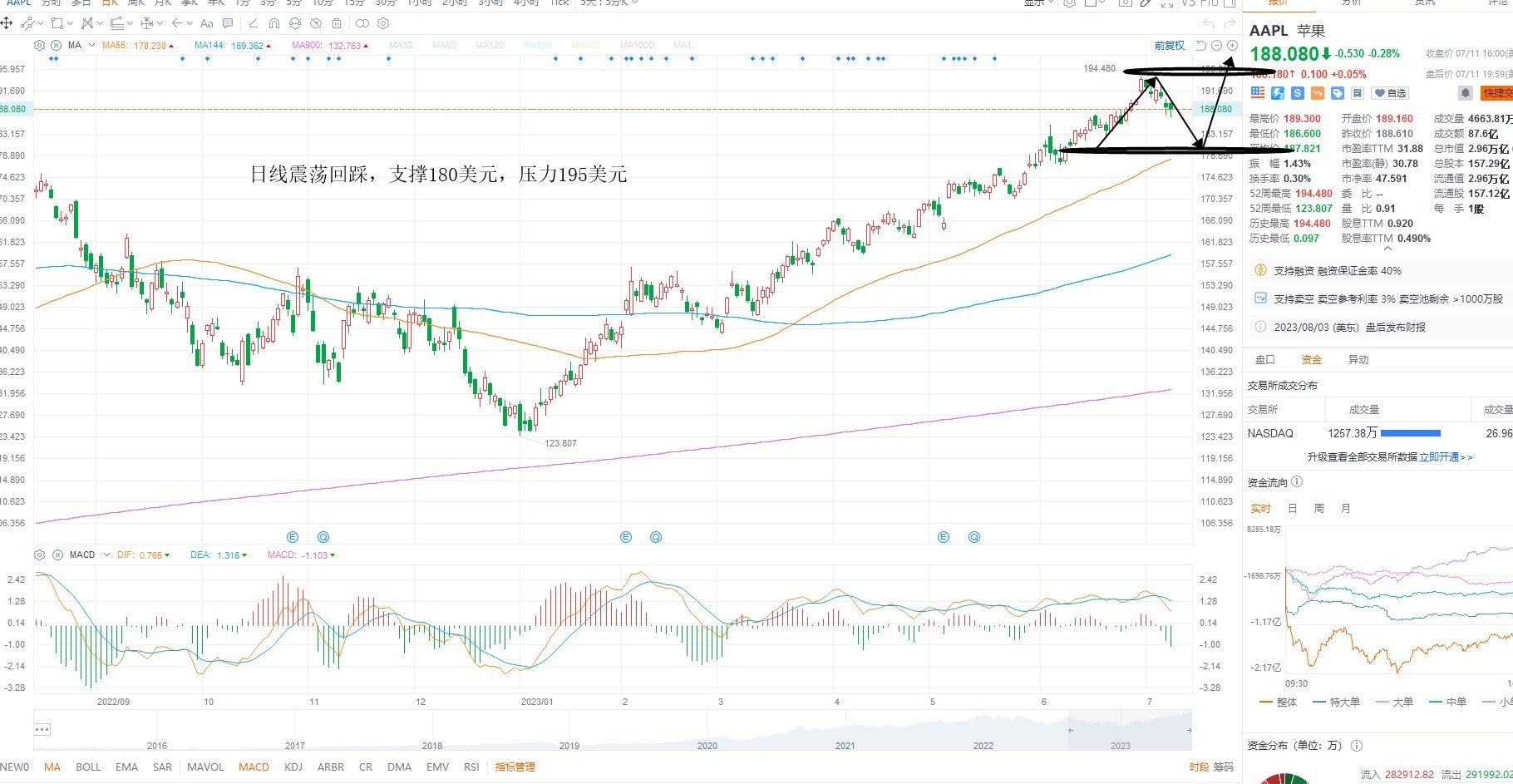 AAPL冲高回落,短期的波动率不大,但结构依然在多头运行之中,只是指数尚未突破之前,权重分化回调,等待均线支撑确认之后的低吸机会为主,需要注意的是目前指标尚未修复完成,日线级别多空分水岭180美元附近低吸,上方压力前期高点195美元突破则打开上行空间