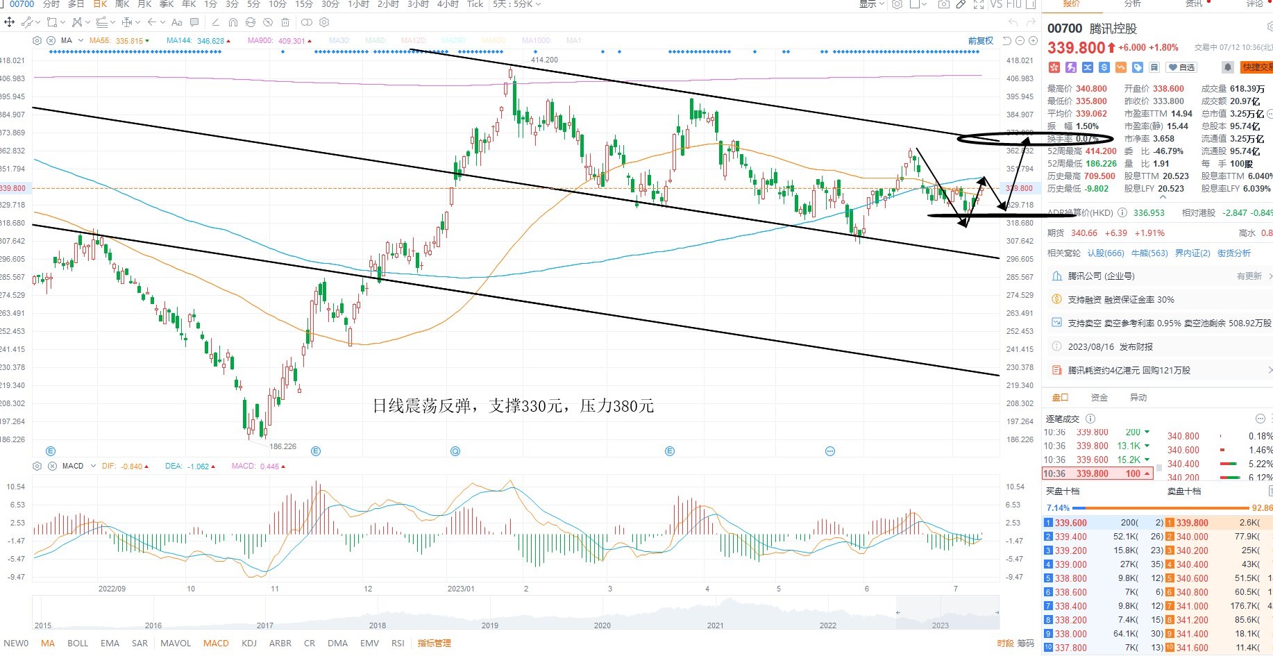 腾讯控股短期维持低位震荡,反复盘整于支撑位置附近,但并未跌破,叠加指数低位,存在共振反弹的可能性,日线级别维持低吸对待,短期多空分水岭330元附近反复低吸,上方通道压力380元附近,需要注意的是目前情绪只是回暖,并未出现大级别的流动性溢价,所以只低吸不追涨