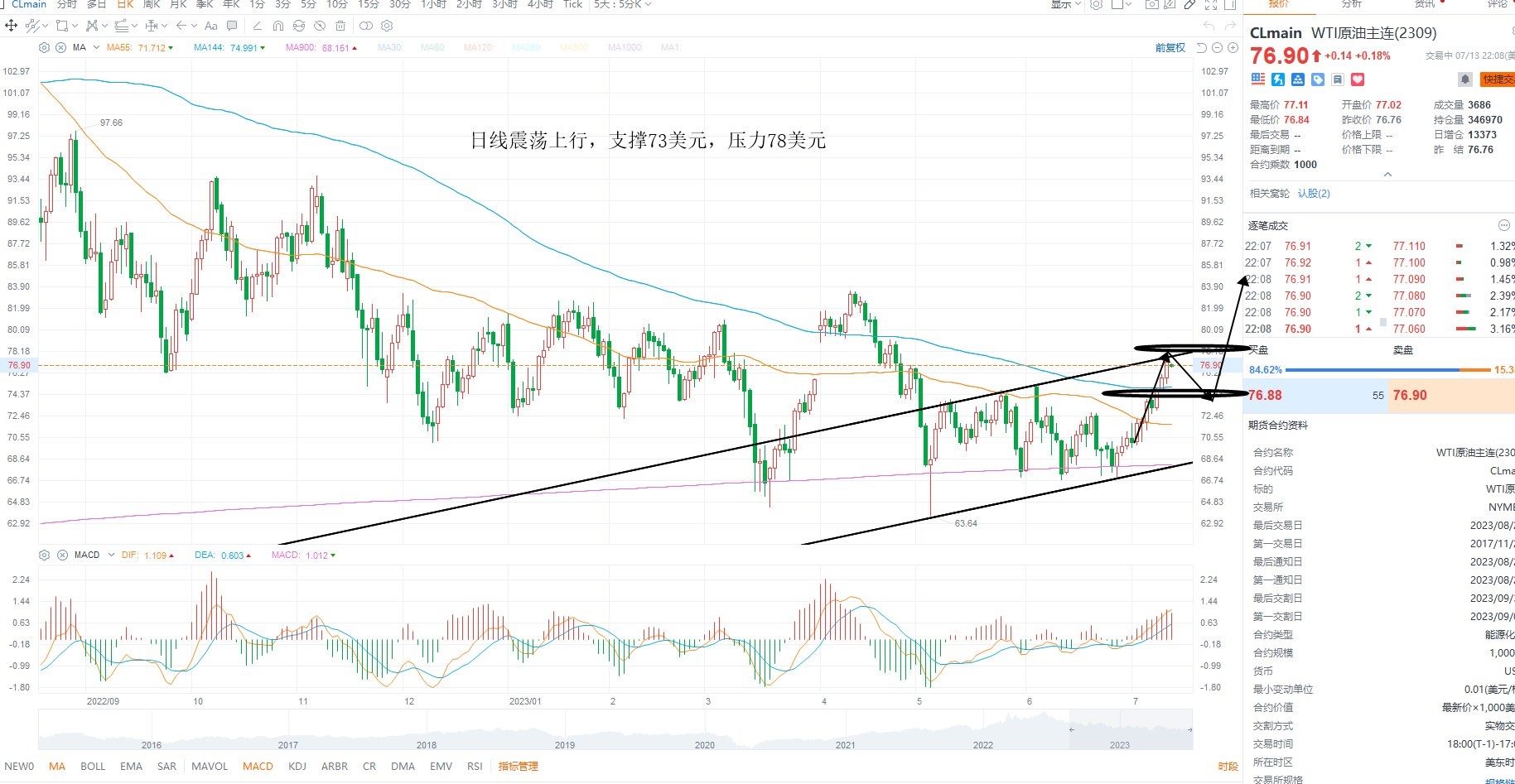 美原油短期继续反弹,但是并未突破通道压力,目前是美联储加息预期放缓,美元走弱,支撑了需求预期反弹,但并未进入实质的需求放量阶段,所以本轮反弹需要等待压力突破之后的方向选择,日线级别多空分水岭78美元站稳,则有望打开上行空间,下方支撑73美元