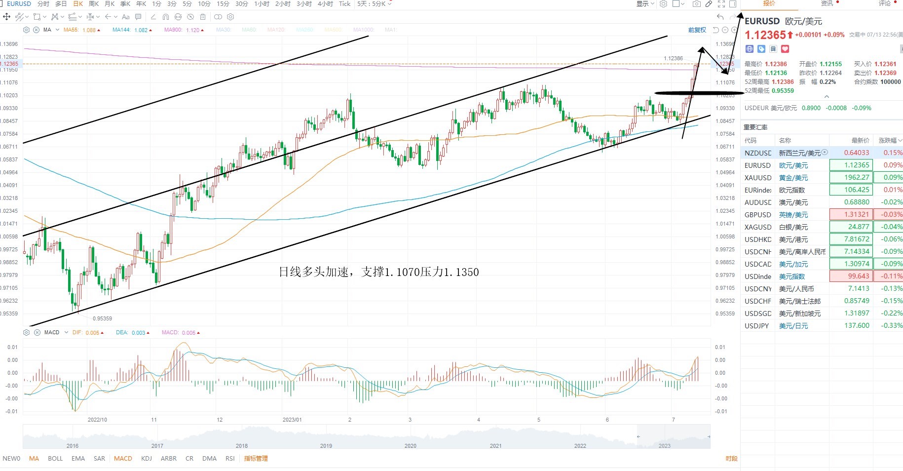 欧美短期继续走强,且非美大幅走高,基本面上美元指数走弱,美债收益率下行,叠加通胀拐头,同时欧元区预期年内两次加息,结构上支撑非美走强,施压美元,短期不排除美元继续向下加速的可能性,欧美日线已经突破,等待回踩低吸机会,下方支撑1.1070,上方压力1.1350