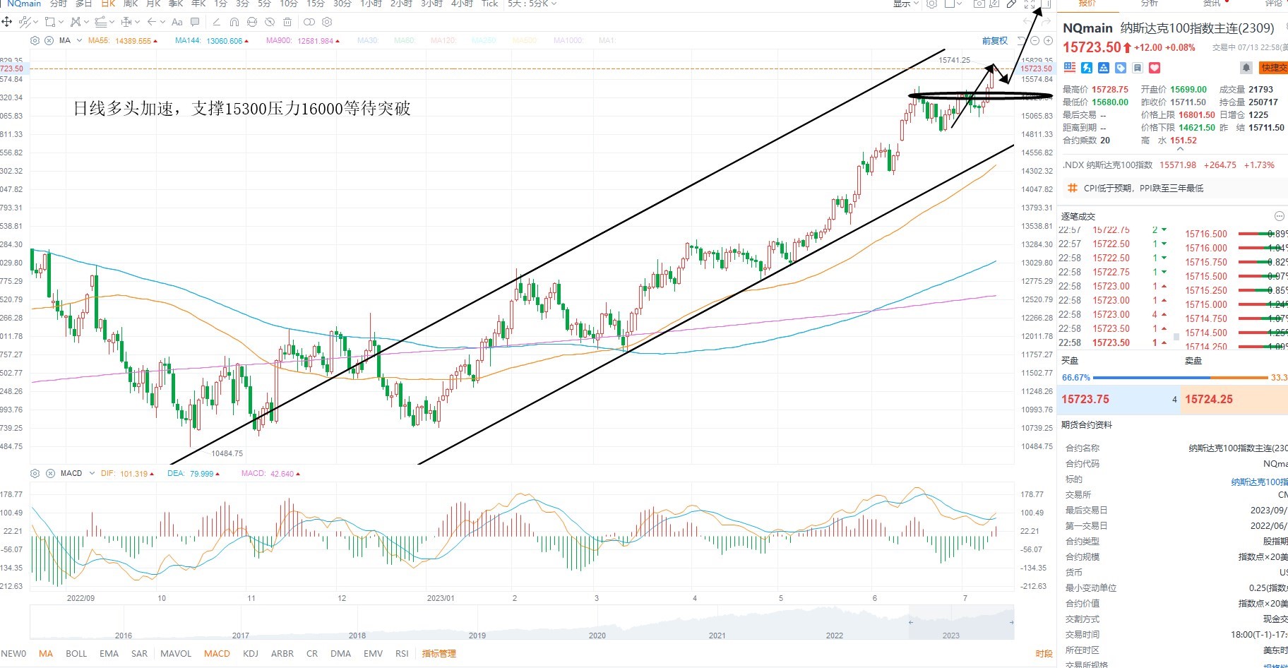 纳斯达克指数继续走强,短期有望进入加速阶段,目前已经突破前期高点,且在美债收益率继续下行的阶段支撑风险资产走强,日内维持低吸对待,等待通道压力测试,日线级别回踩支撑15300不破,维持多头结构不变,上方压力16000整数关