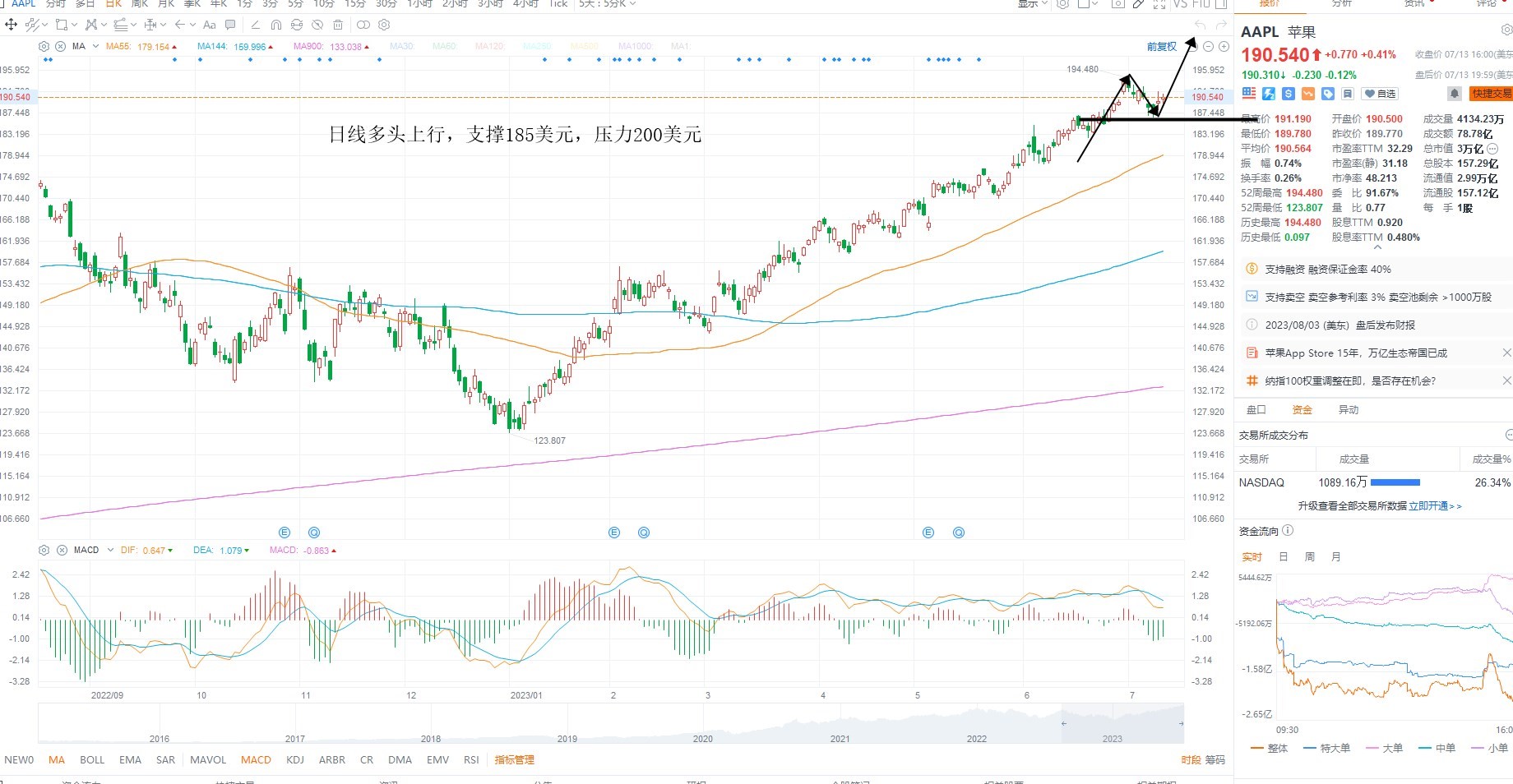 AAPL短期维持多头上行,回踩之后继续上涨,且指数已经新高,短期不排除AAPL加速的可能性,日内维持低吸对待,等待权重共振为主,日线级别上来看,日内支撑185美元不破,反复低吸,上方压力200美元突破,则打开上行空间