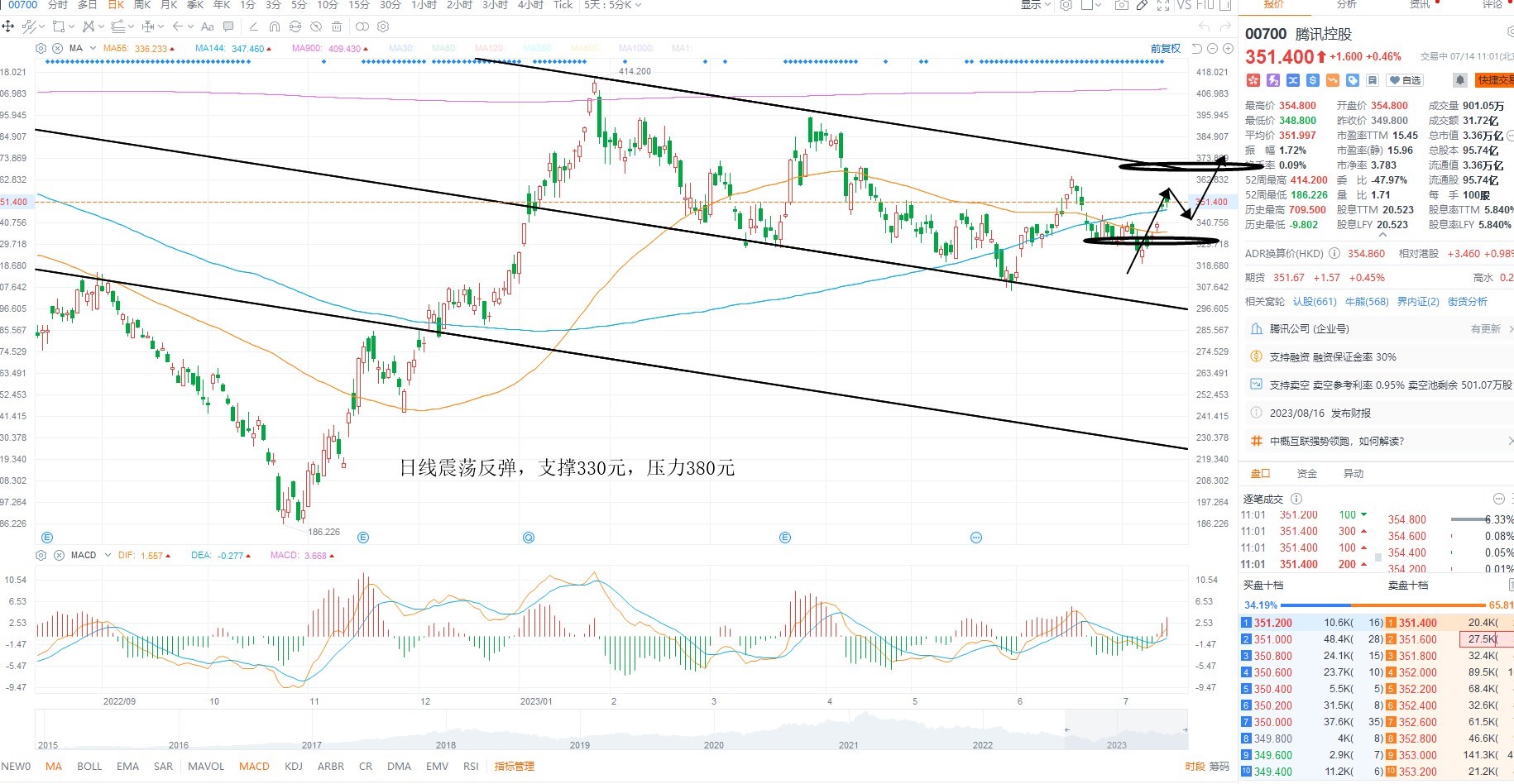 腾讯控股短期继续走高,目前跟随指数反弹,尚未突破下降通道,日内回踩低吸为主,等待突破之后的方向选择,基本面上情绪回暖,但是成交依然不济,等待放量,日线级别多空分水岭330元附近反复低吸,上方压力380元附近