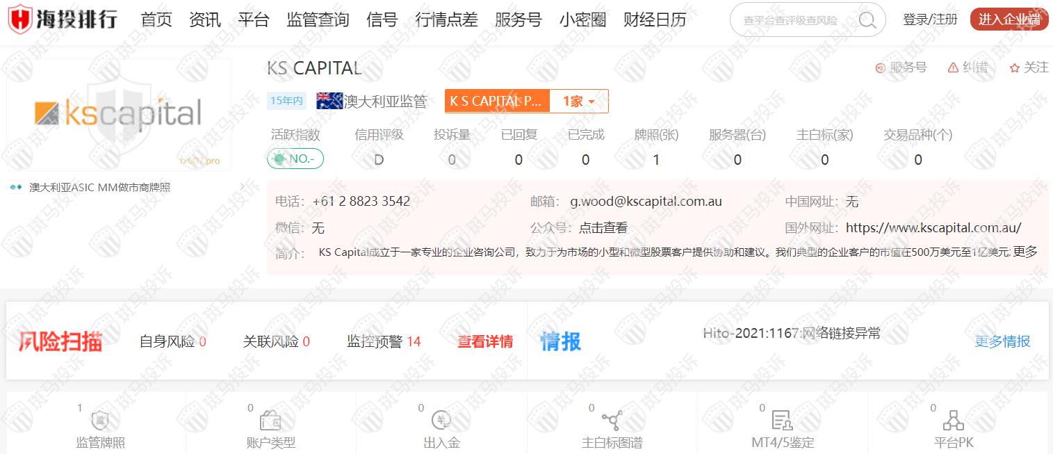 KS CAPITAL从2007年开始受澳大利亚ASIC监管,监管号码316880,风险扫描显示14条风险,投资者需注意其风险提示信息。