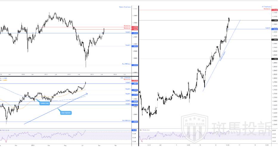 在周线图的背景下,日线图上的价格走势短期突破了1.3001美元的阻力位,目前正逼近位于周线阻力位1.3197美元南侧的另一层阻力位(此类阻力位称为卡西莫多阻力位)电阻)。有趣的是,相对强弱指数(RSI)目前在日线范围内已大幅超买,挑战2020年8月(78.40)以来的最高点。