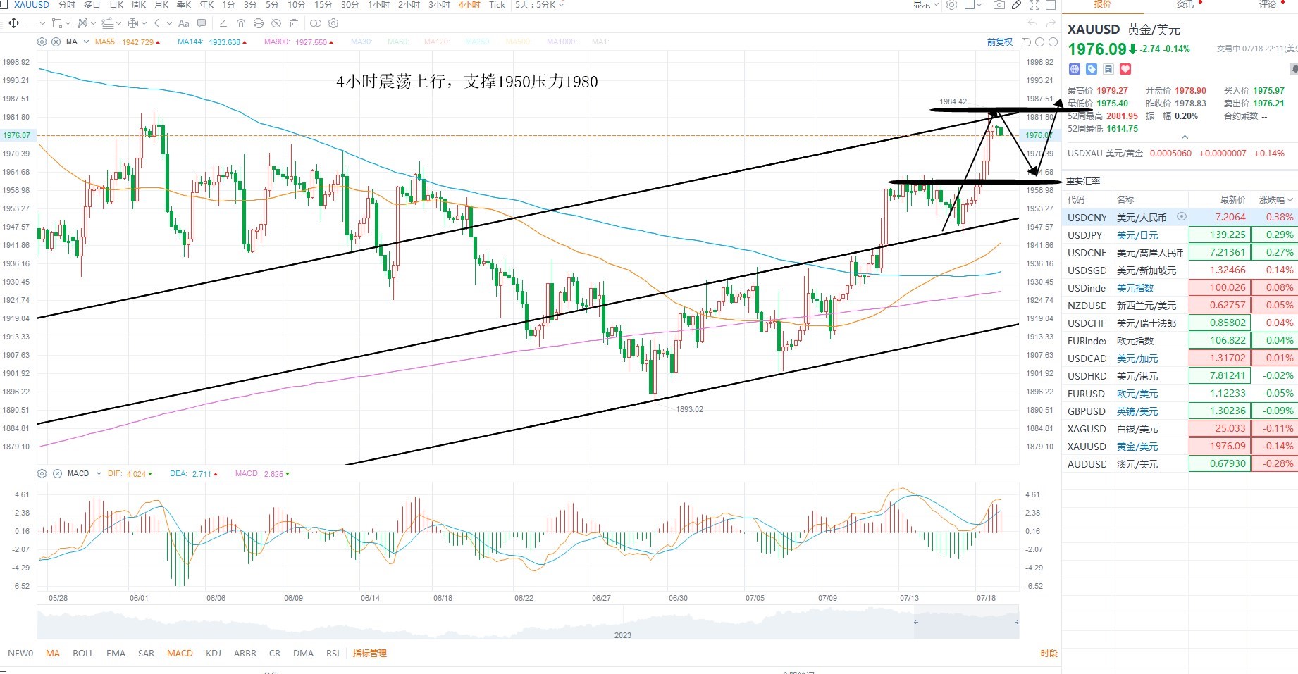 黄金短期继续反弹,但接近4小时级别通道压力,且美元指数存在超跌反弹的需求,短期不宜追涨,等待回踩低吸机会为主,基本面上对于美联储加息预期继续放缓,不过还是要等利率决议落地为主,4小时级别上来看,通道压力1980附近突破,则有望打开上行空间,下方支撑1950附近