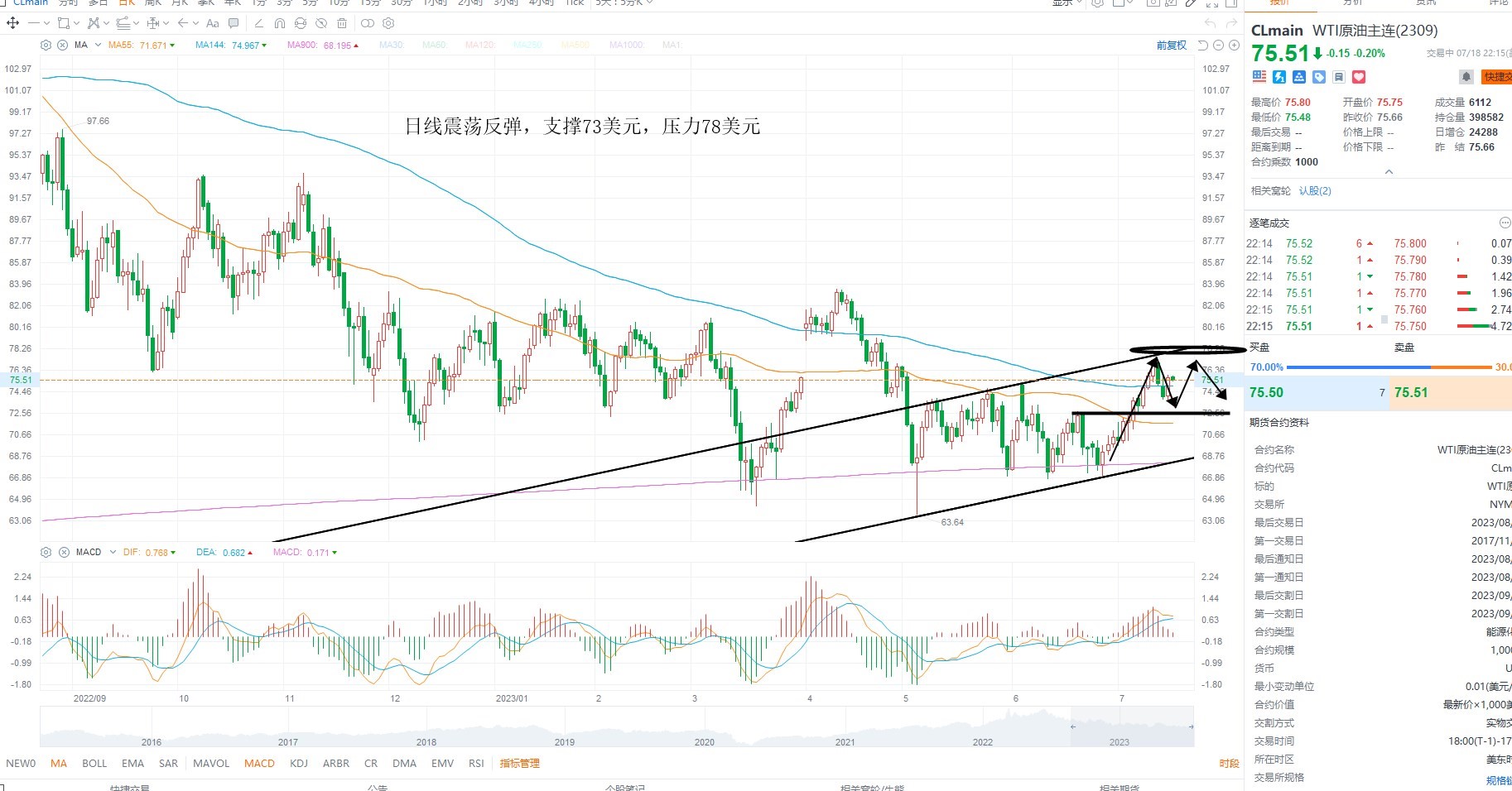 美原油震荡反弹,短期并未突破通道压力,基本面上需求预期有所回暖,支撑油价走高,但是库存数据尚未落地,且美元指数存在反弹的需求,因此日内若无法突破通道压力则不排除冲高回落的可能性,短期等待低吸机会为主,日线级别多空分水岭73美元附近回踩不破,多头结构不变,上方压力78美元附近