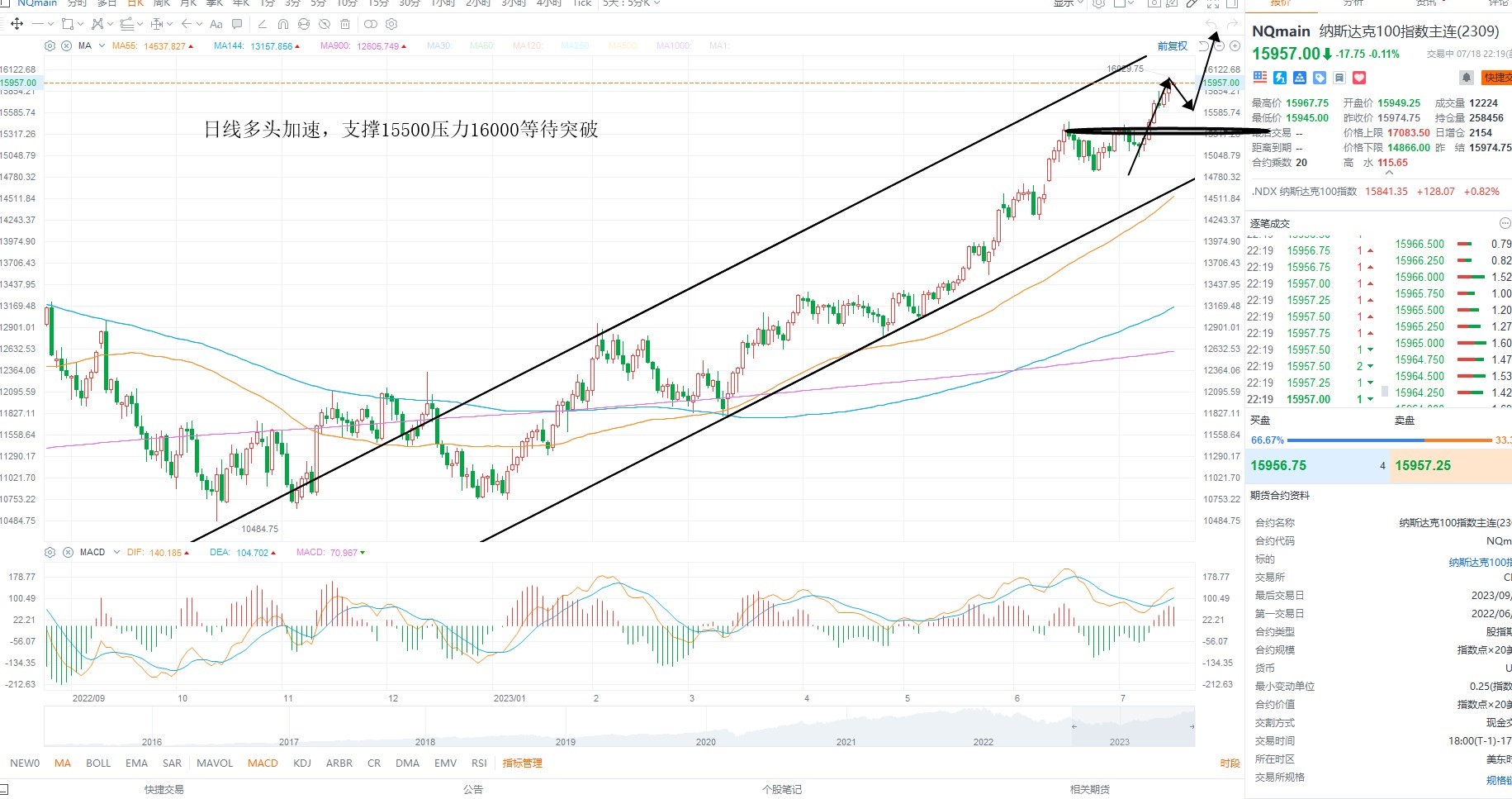 纳斯达克指数继续走高,短期新高之后有望继续加速,基本面上风偏继续走高,加息压力继续放缓,且不排除年内停止加息的可能性,叠加美债收益率继续下滑,支撑风险资产走强,日线级别回踩低吸,下方支撑15500附近,上方压力16000,突破则打开上行空间,需要注意的是目前属于加速阶段,追涨存在一定风险,低吸为主