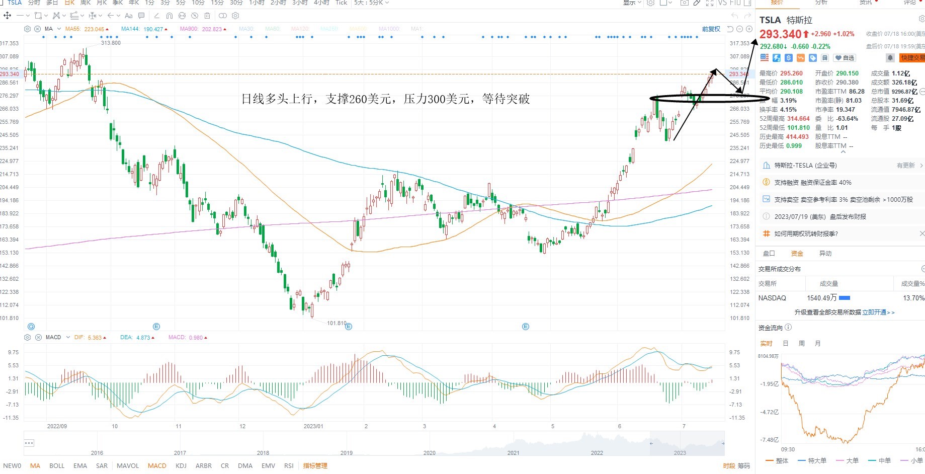 TSLA短期继续走高,且接近密集压力区间,基本面上属于分子端的反馈,且美债收益率下行,需求预期改善,支撑估值上行,但没有突破300美元整数关压力之前,需要等待回踩低吸,谨防指数冲高回落,权重共振调整,日内多空分水岭260美元附近不破,维持多头结构