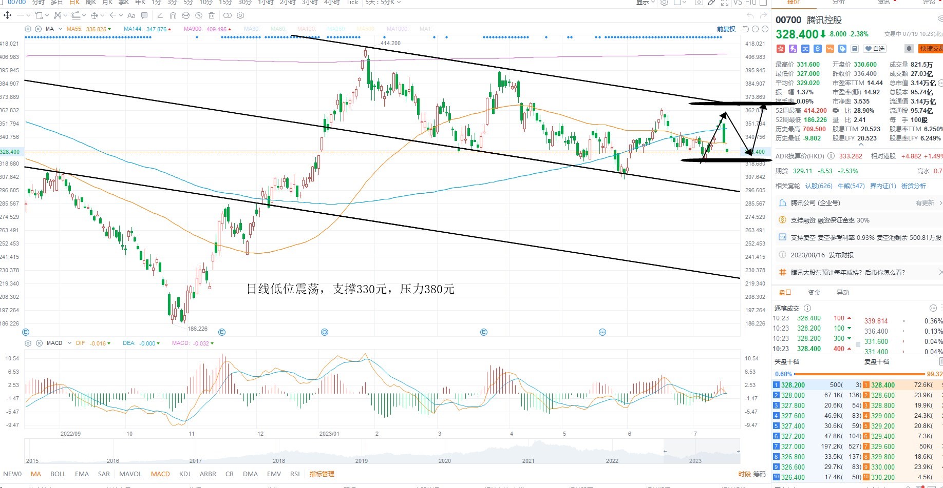 腾讯控股反弹之后再次回踩330元附近支撑,而指数并未跌破前期低点,且市场情绪相对低迷,成交没有有效放大,整体结构偏低位震荡,日内等待企稳之后的低吸机会为主,权重共振破位的概率不大,等待反弹测试通道压力380元附近
