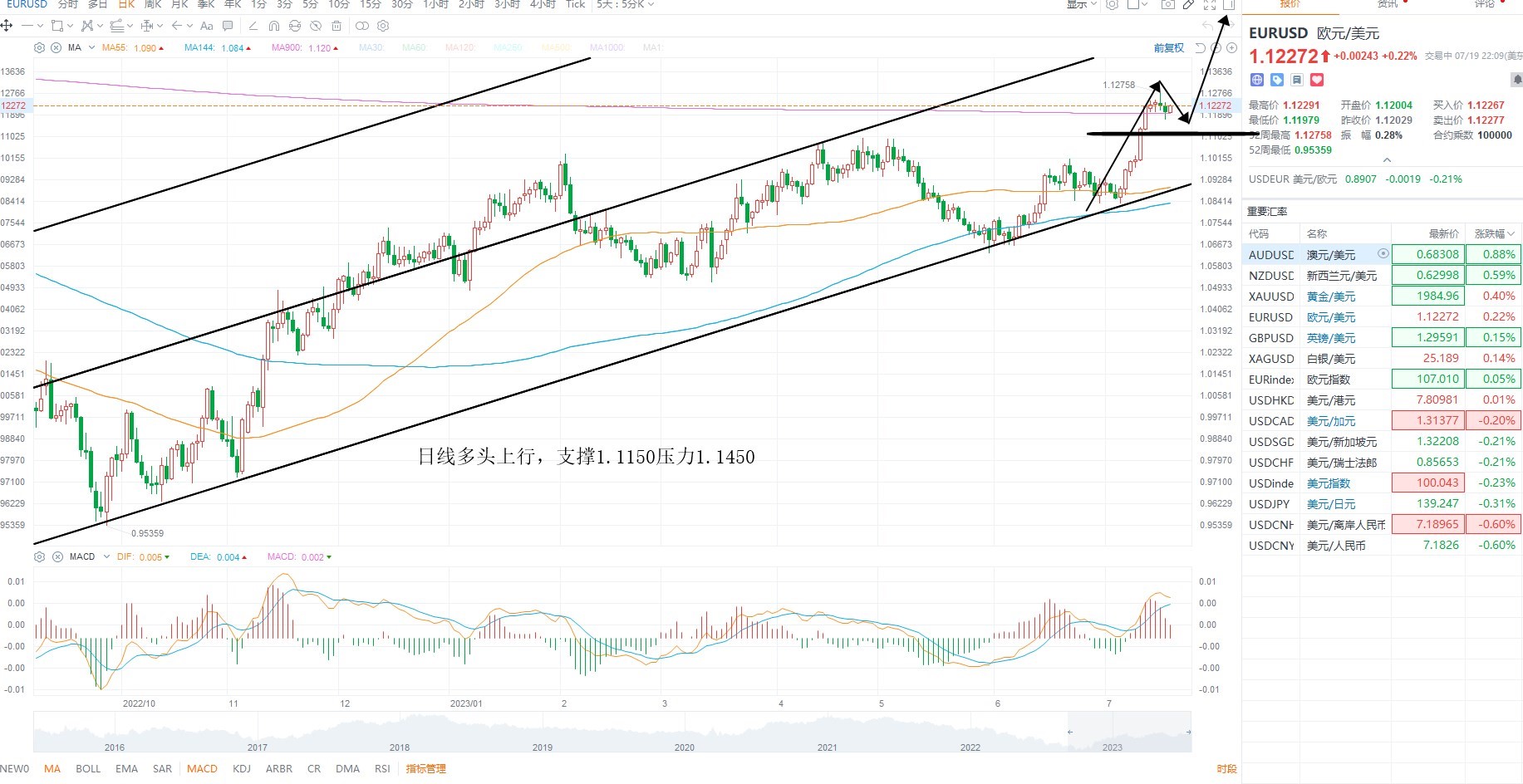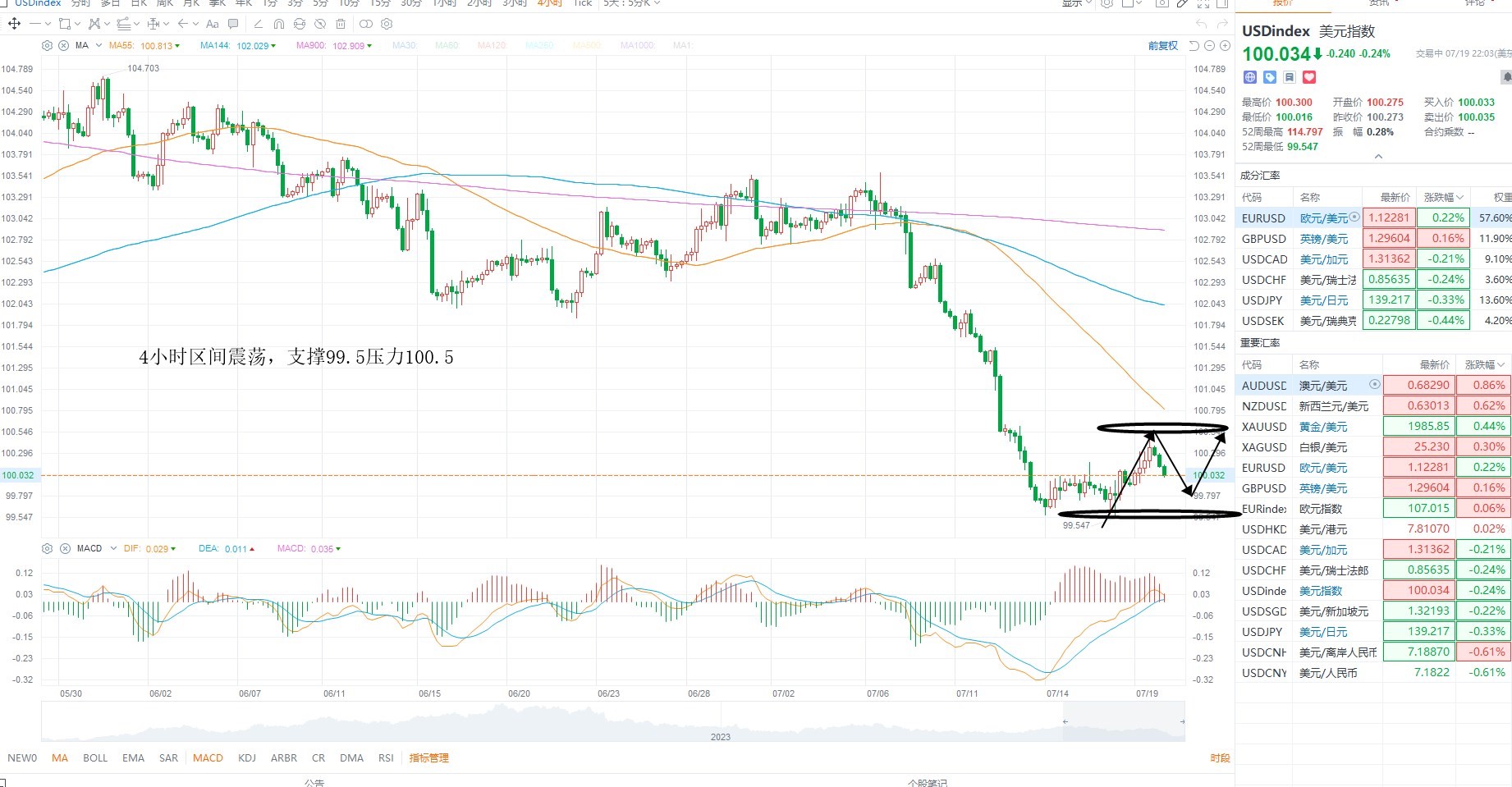 美元指数小幅反弹,短期只是超跌修正,因通胀数据超预期下行,所以市场预期美联储继续加息的概率很小,基本面上不支持美元反弹,等待压力测试之后的沽空机会为主,金价方面短期继续反弹,且有望突破区间压力之后进入加速区间,但要注意短期大幅上涨之后不宜追涨,等待回踩低吸机会为主,谨防美元反弹,金价冲高回落,美原油方面维持在高位震荡,短期并未突破通道压力,结构上等待方向选择为主