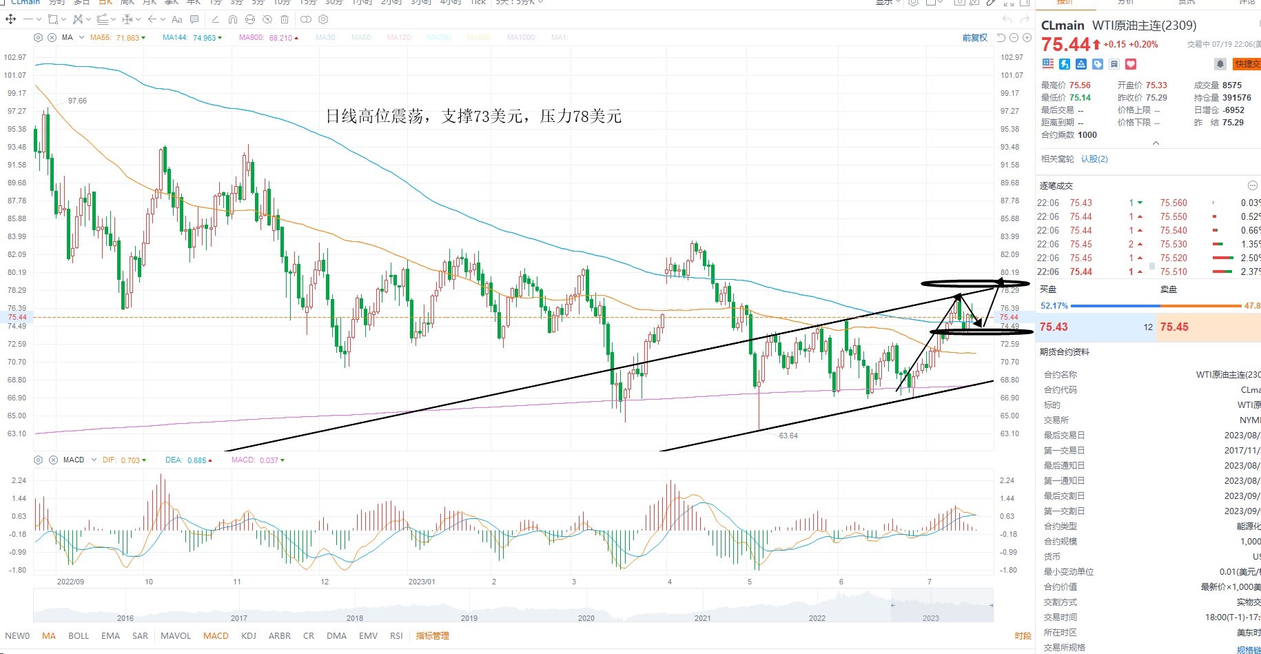 美原油短期维持高位震荡,目前并未突破通道压力,整体结构上因美元指数走低,支撑油价向上走高,而需求端预期的改善,叠加库存下行支撑油价多头,日内等待回踩低吸机会为主,日线级别支撑73美元不破,多头结构不变,上方压力78美元突破,则打开上行空间
