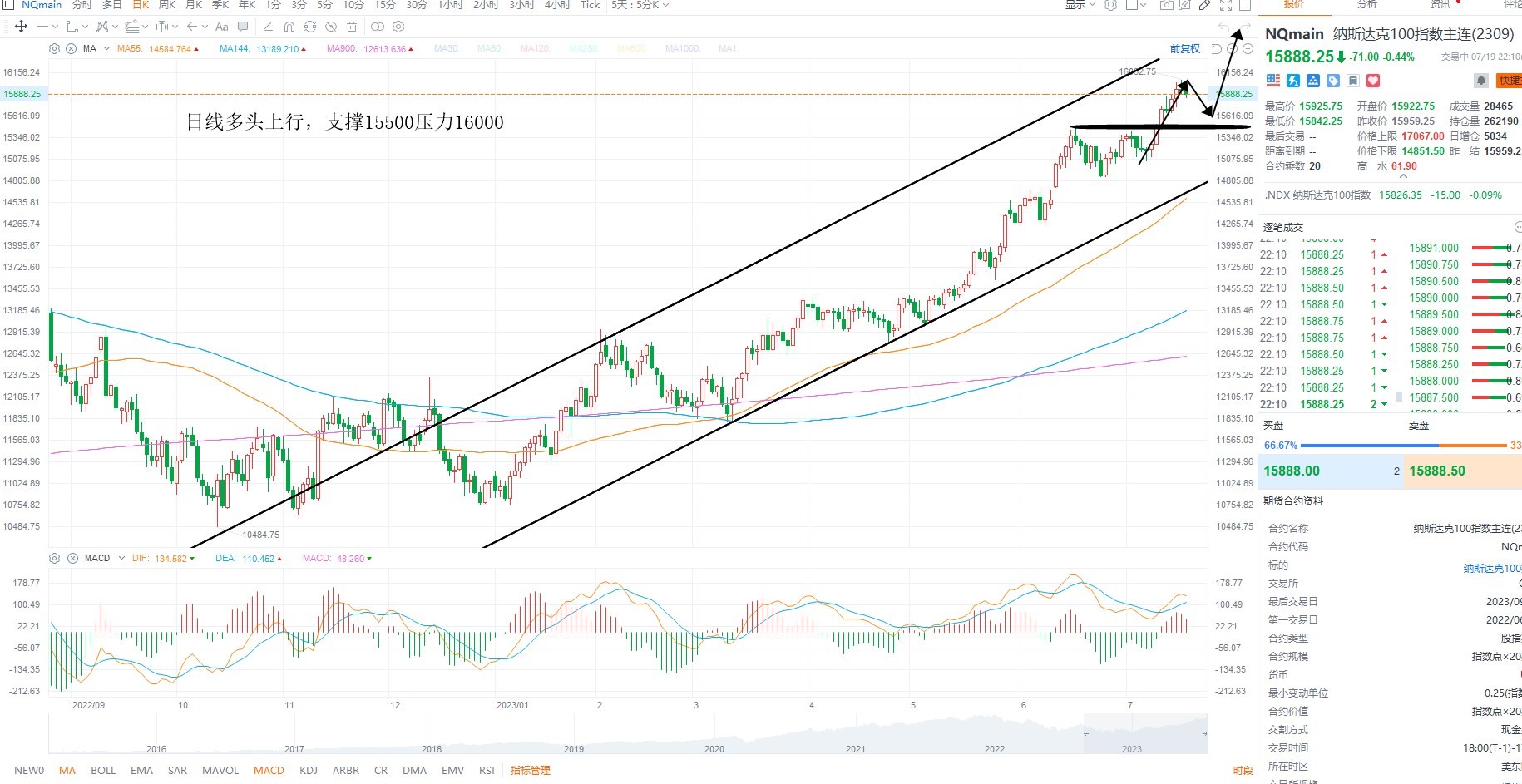 纳斯达克指数继续走高,但短期加速之后指标进入超买区间,不排除背离的可能性,叠加权重分化,短期不宜追涨,等待回踩低吸机会,中期方向依然维持多头结构,日线级别回踩支撑15500附近反复低吸,上方站稳16000则打开上行空间