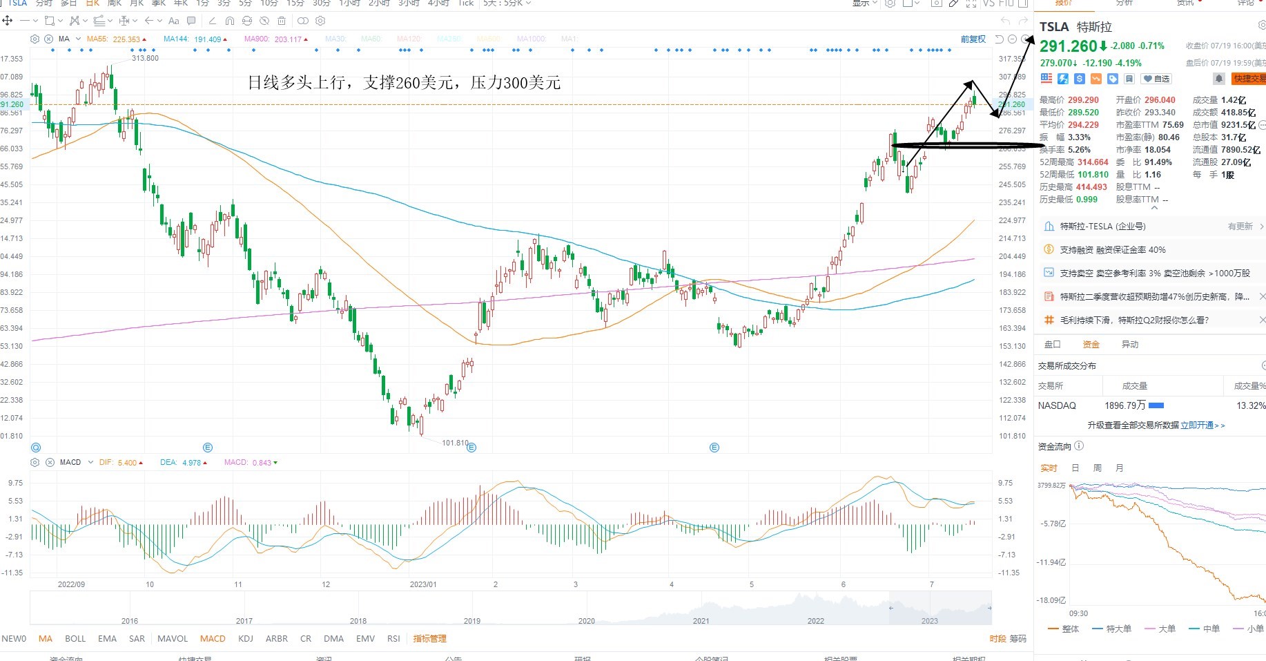 TSLA短期冲高回落,目前并未进入调整阶段,但是密集压力区间若没有持续的放量叠加指数的共振,则很难向上突破,日内等待回踩之后的低吸机会为主,日线级别多空分水岭260美元回踩不破,反复低吸,上方压力300美元附近,突破,则打开上行空间