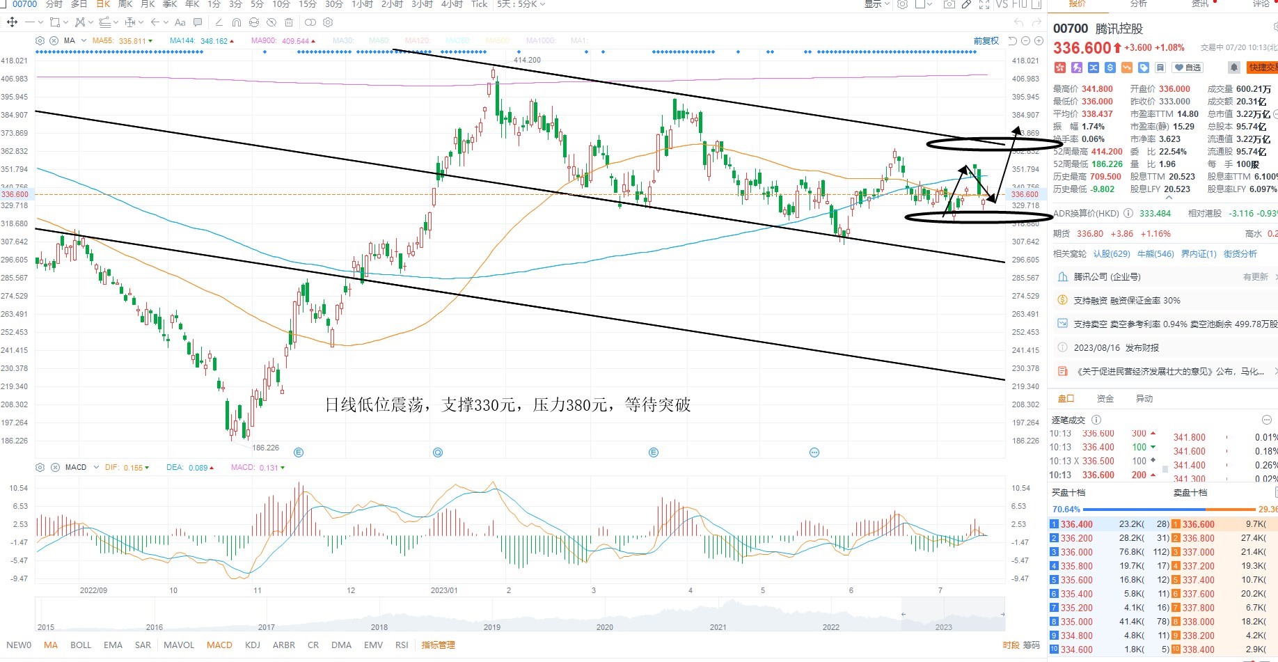 腾讯控股短期维持在低位震荡,目前并未选择向上突破,考虑到指数依然在低位盘整,目前等待情绪回暖之后的放量为主,日线级别支撑330元附近盘整不破,反复低吸,上方压力380元附近,等待权重共振突破为主
