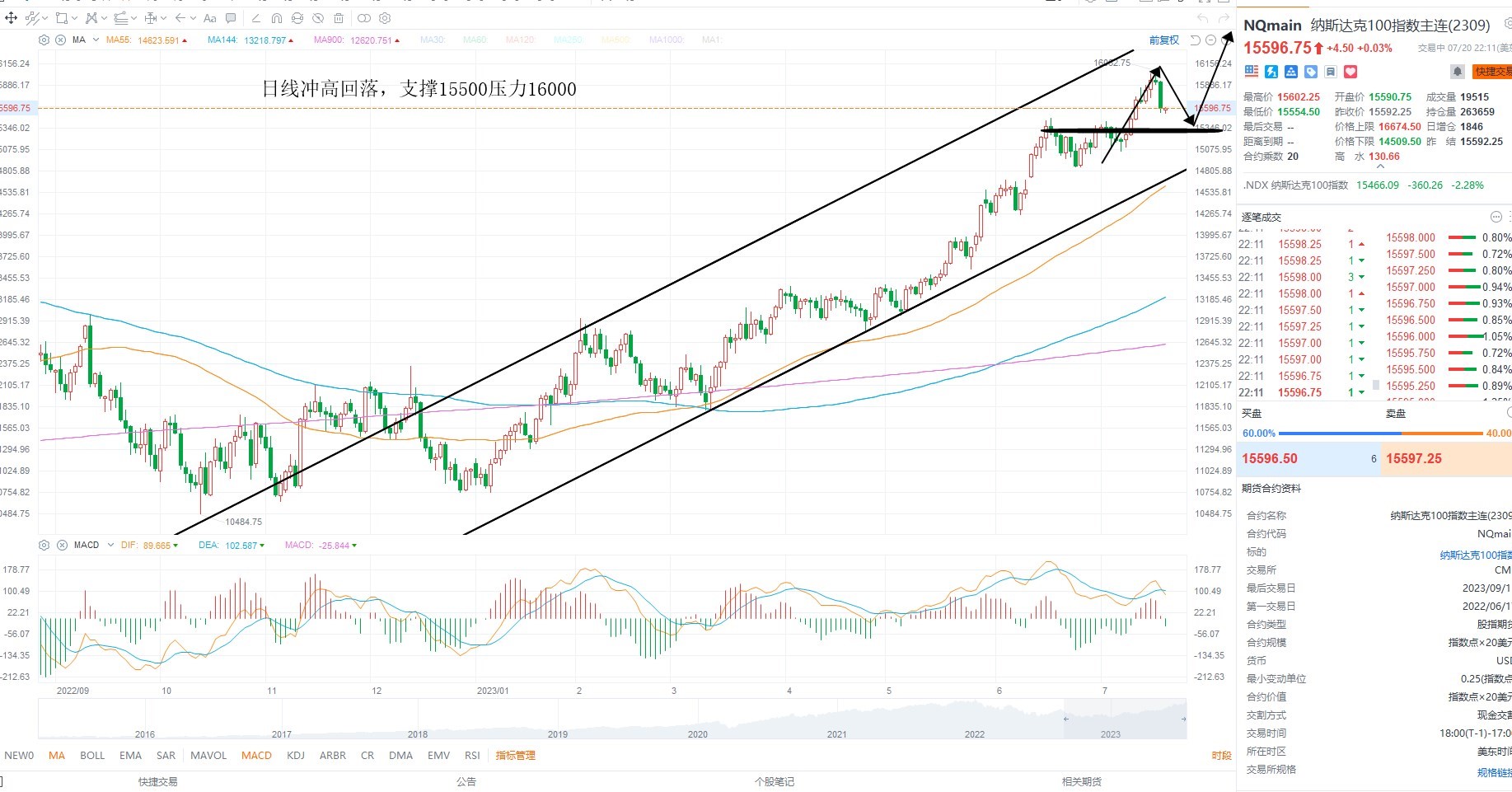 纳斯达克指数冲高回落,短期美元指数反弹,但市场风偏并未改变,只是短期指数大幅上行之后存在修正的需求,基本面上依然是多头结构,且指标出现超买背离迹象,结构上等待回踩低吸机会为主,日线级别支撑15500附近回踩不破,等待低吸,上方压力16000突破则打开上行空间