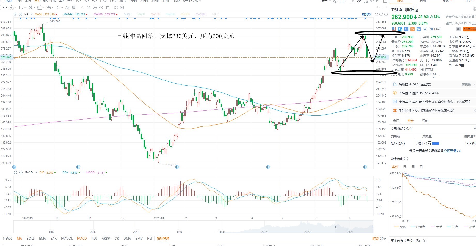 TSLA大幅走低,短期已经出现背离迹象,且中报不及预期,主要是降价销售,影响毛利率,同时指数共振回落,短期不排除深度调整的可能性,当前阶段,若再次回踩230美元附近,则不排除箱体下沿支撑进入再次反弹区间的可能性,等待低吸,上方压力300美元