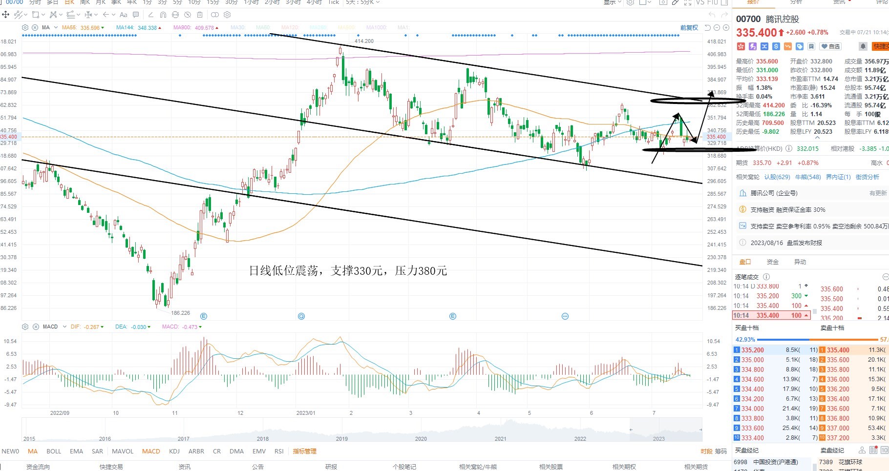 腾讯控股维持低位盘整,目前指数有企稳迹象,但是依然要等待连续放量之后的共振机会,虽然短期缩量之后存在地量地价的可能性,但美元指数没有加速下行之前,成交很难持续放大,日内支撑330元附近反复低吸,等待380元通道压力测试为主