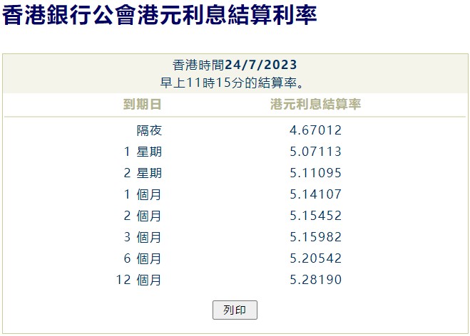 7月24日消息,美联储议息前夕,港元(7.8122,-0.0046,-0.06%)拆息全线下跌,与楼按相关的一个月拆息报5.14107%,下跌5.036基点,连跌两日;反映银行资金成本的三个月拆息报5.15982%,跌3.816基点。