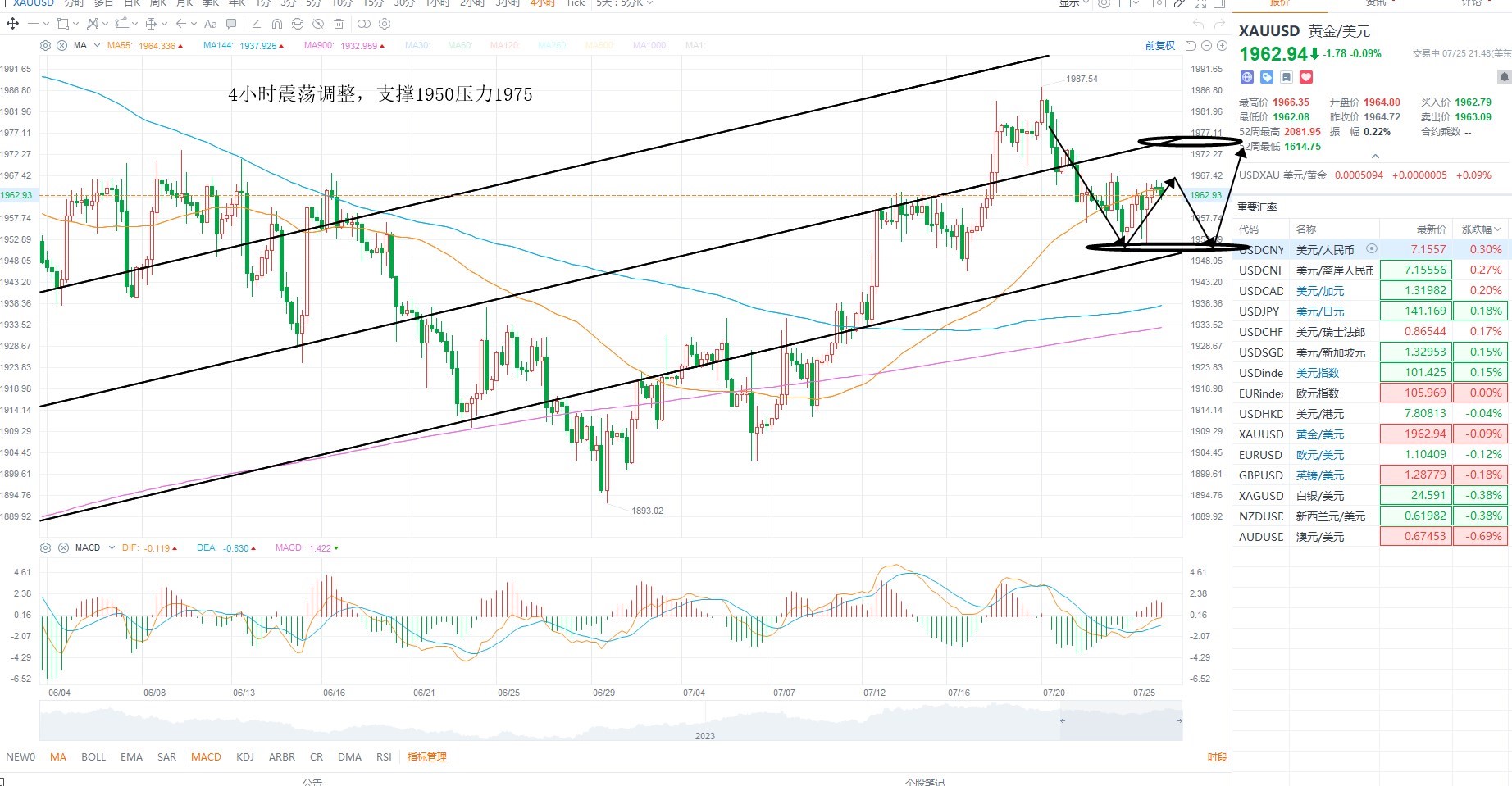黄金短期维持区间震荡,目前4小时依然在多头结构之中,只是指标尚未调整到位,且美元指数超跌反弹施压金价,结构上需要等待美联储利率决议之后的方向选择,预期上年内有望完成最后一次加息,具体需要观察美联储主席鲍威尔的表述是否转入鸽派,从而支撑金价走强,日内支撑1950不破,则反复低吸,上方压力1975突破则有望加速上涨