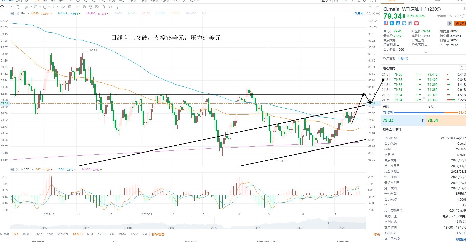 美原油短期维持多头结构,且有望加速上行,目前属于通道突破之后的加速机会,不过距离密集压力区间并不远,所以不要追涨,短期等待库存数据落地之后的方向选择,同时关注美联储利率决议是否支撑需求端进一步回暖,日线级别多空分水岭82美元突破则进入多头反转区间,下方支撑75美元附近