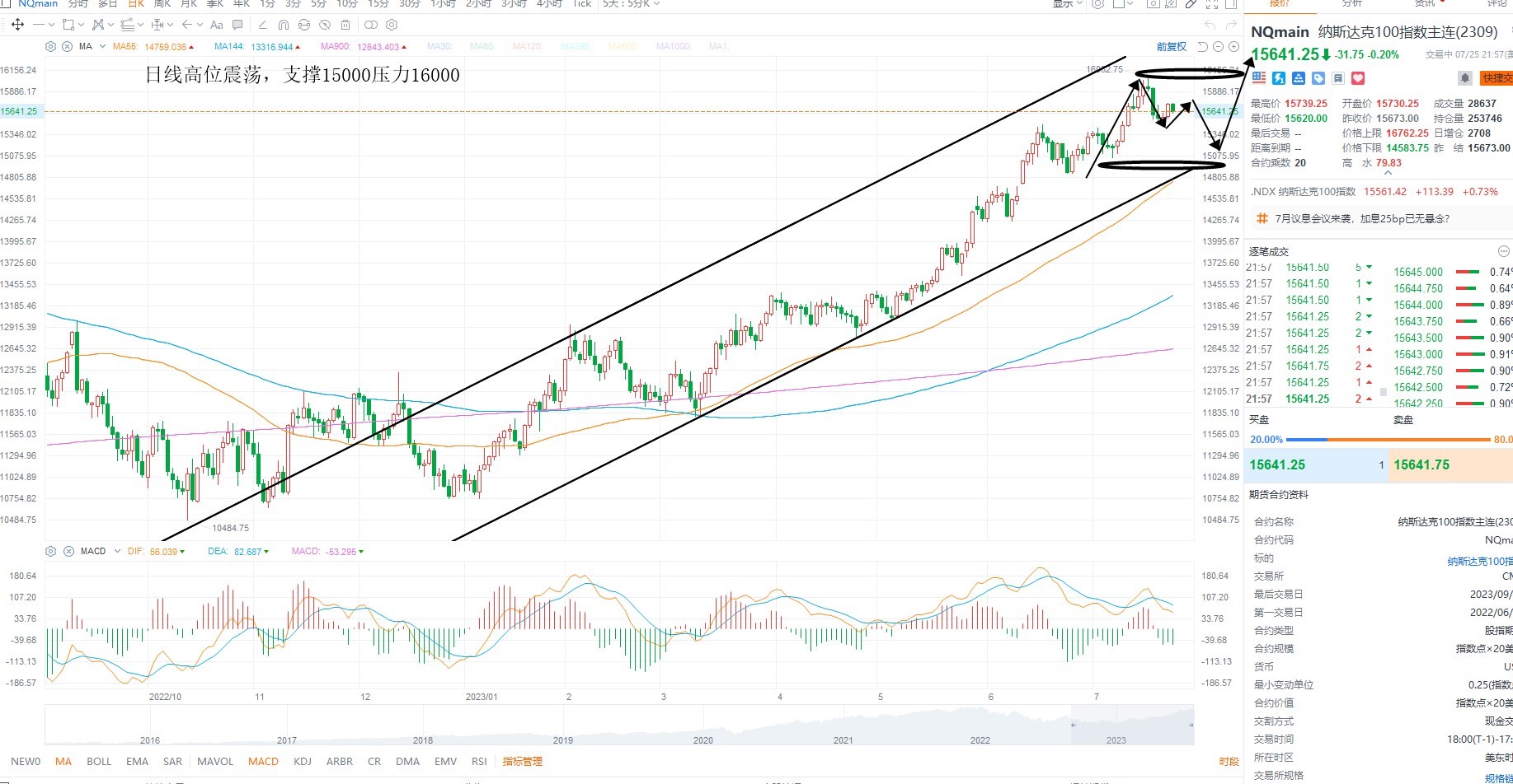 纳斯达克指数短期调整,目前基本面上主要是权重业绩不及预期,但的确此前指数涨幅较大,调整属于合理,在没有跌破通道支撑之前,等待调整之后的低吸机会为主,日线级别多空分水岭15000不破,则中期多头结构不变,等待指标修正完成,上方压力16000附近