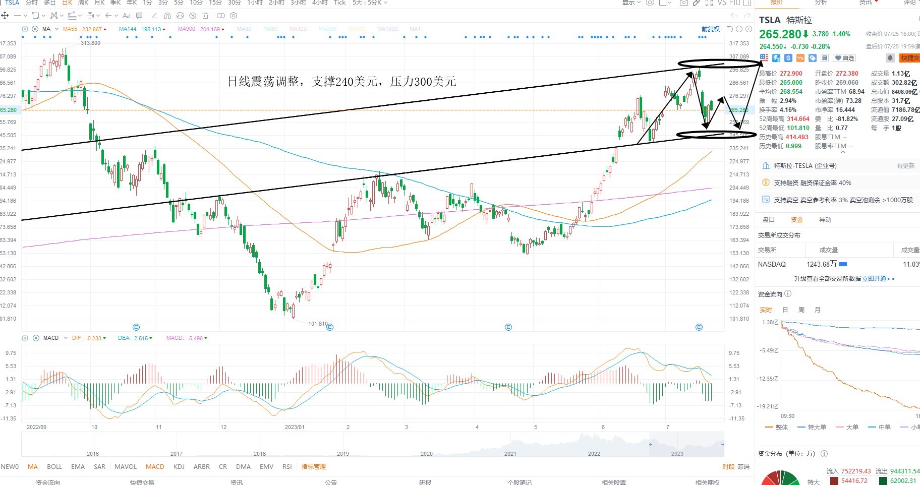 TSLA短期冲高回落,这里的调整是对此前涨幅的修正,且指标进入超买区间之后存在调整的需求,叠加中报不及预期,同时指数回落,形成了共振级别的调整,目前依然在多头区间之内,若反复盘整于240美元上方,则等待企稳低吸,上方压力300美元