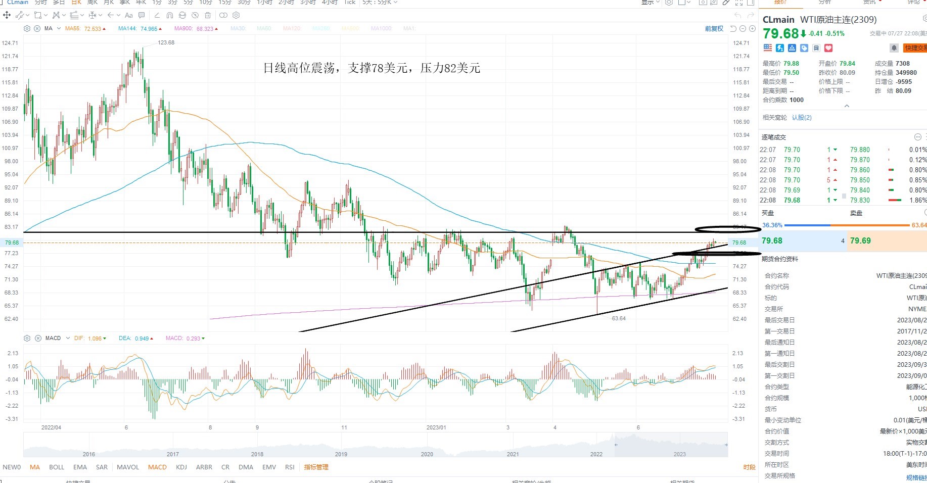 美原油维持高位震荡,短期并未突破密集压力区间,而美国经济数据提振美元,不利油价走强,同时需求预期并未释放,继续关注美联储对于加息的态度,以及需求端的变化,日线级别上来看,目前多空分水岭82美元附近,突破则有望进入反转区间,下方支撑78美元附近