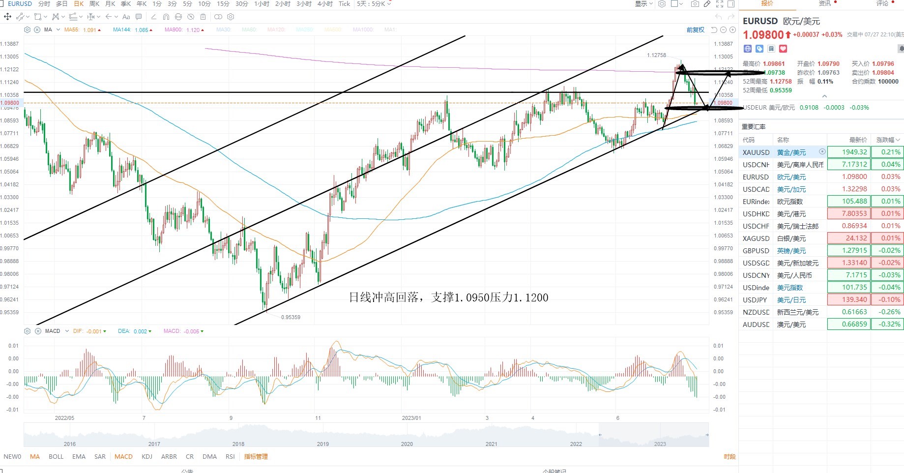 欧美短期大幅下跌,整体结构依然再多头区间之内,因美元走强,施压非美货币,但美元指数没有突破区间压力之前,维持等待为主,非美等待企稳机会,日线级别上来看,欧美多空分水岭1.0950跌破则进入空头区间,盘整不破则等待企稳低吸,上方压力1.1200