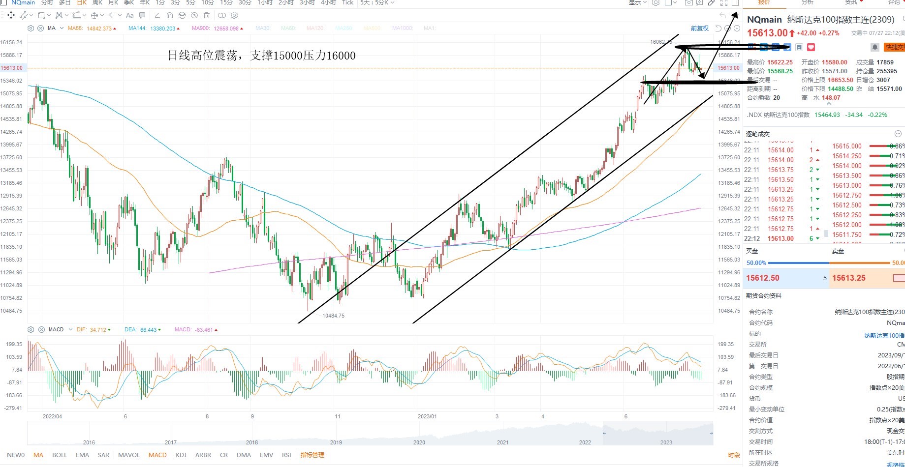 纳斯达克指数维持高位震荡,目前并未进入反转区间,只是等待指标修正之后的方向选择,基本面上经济数据强劲,提振分子端增速走高,短期等待权重修正之后的共振机会为主,日线级别上来看,短期盘整不破15000则逢低吸纳,等待16000压力突破之后的加速机会