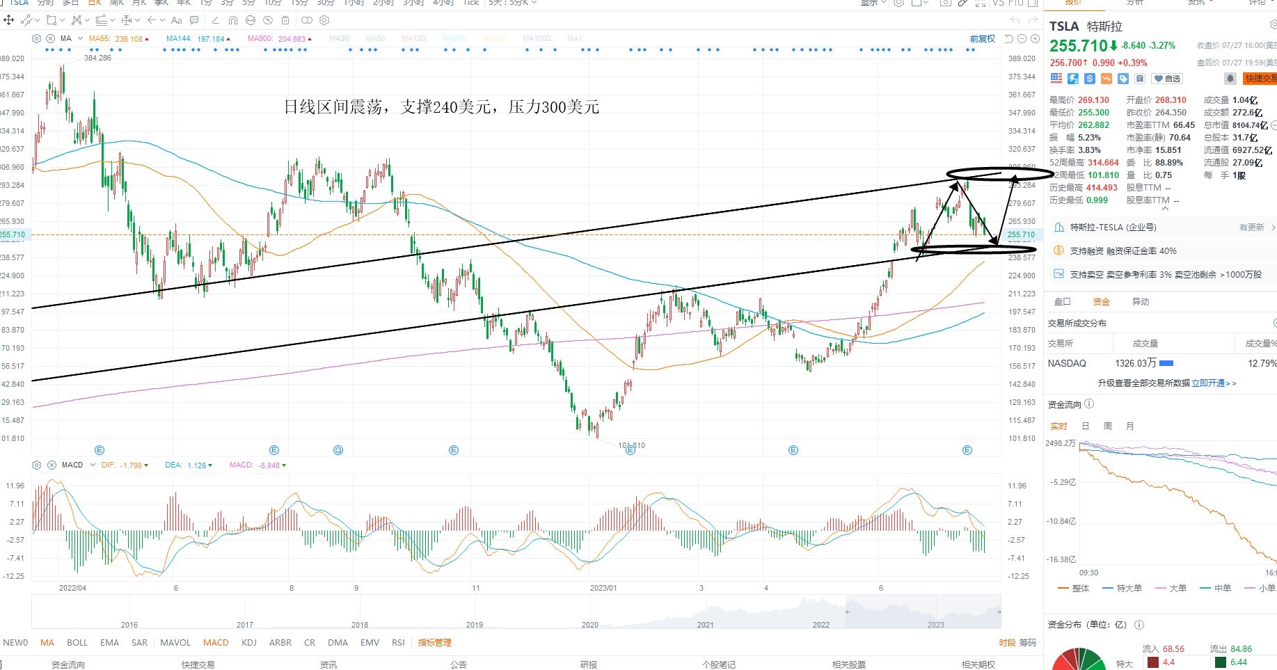TSLA短期继续调整,虽然指数并未跌破支撑区间,但是权重分化,目前需要等待二次共振之后的方向选择,基本面上业绩增速不及预期,施压分子端估值走高,短期多空分水岭240美元盘整不破,则等待企稳低吸机会,上方压力300美元整数关